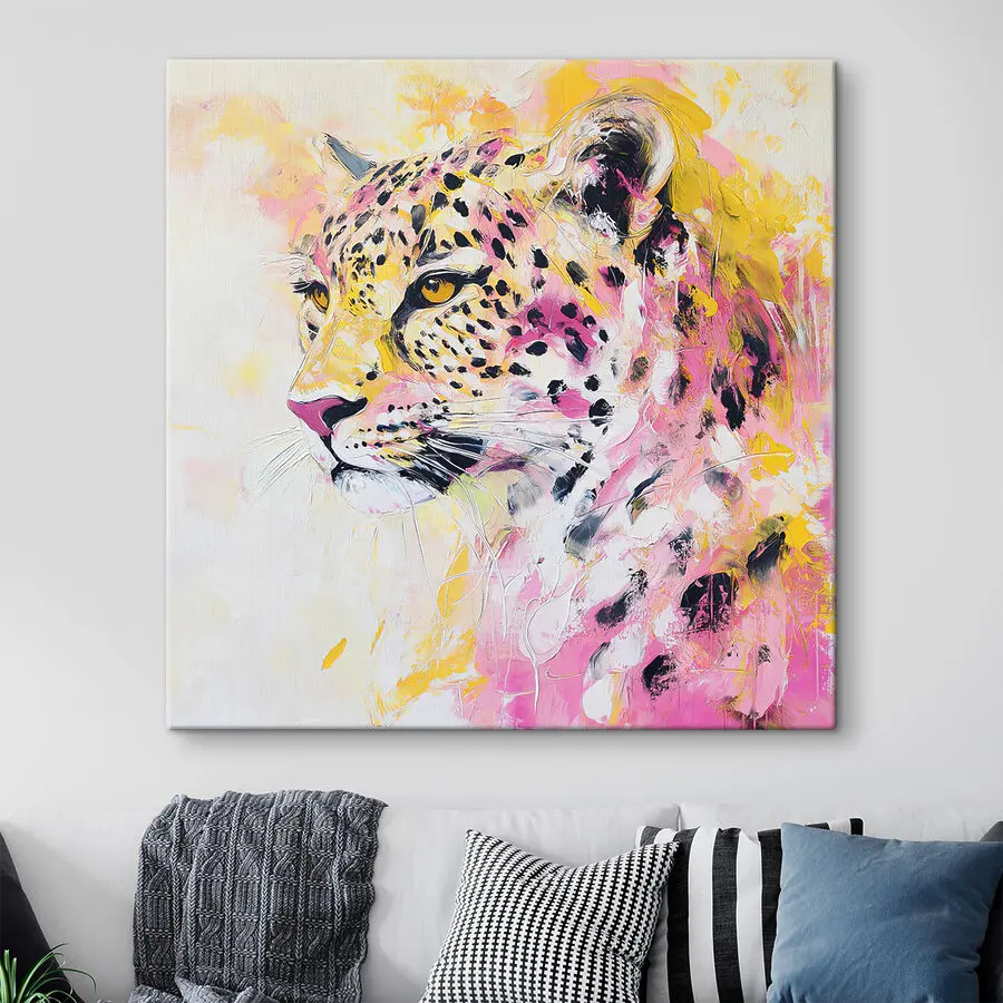 Deze levendige canvasprint van een jachtluipaard is als een vleugje wilde kleur in je kamer. Het is een blikvanger, toch? De mix van gedurfde gele en roze tinten – het lijkt wel alsof de cheeta een dagje in de spa doorbrengt – geeft een abstracte draai aan zijn woeste elegantie. Stel je voor dat je je woonkamer binnenloopt; het voelt alsof deze grote kat je chille kamergenoot is, die je stilletjes motiveert om moedig en vrijgevochten te zijn. Perfect voor iedereen die houdt van kunst die indruk maakt maar zichzelf niet al te serieus neemt!