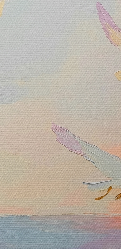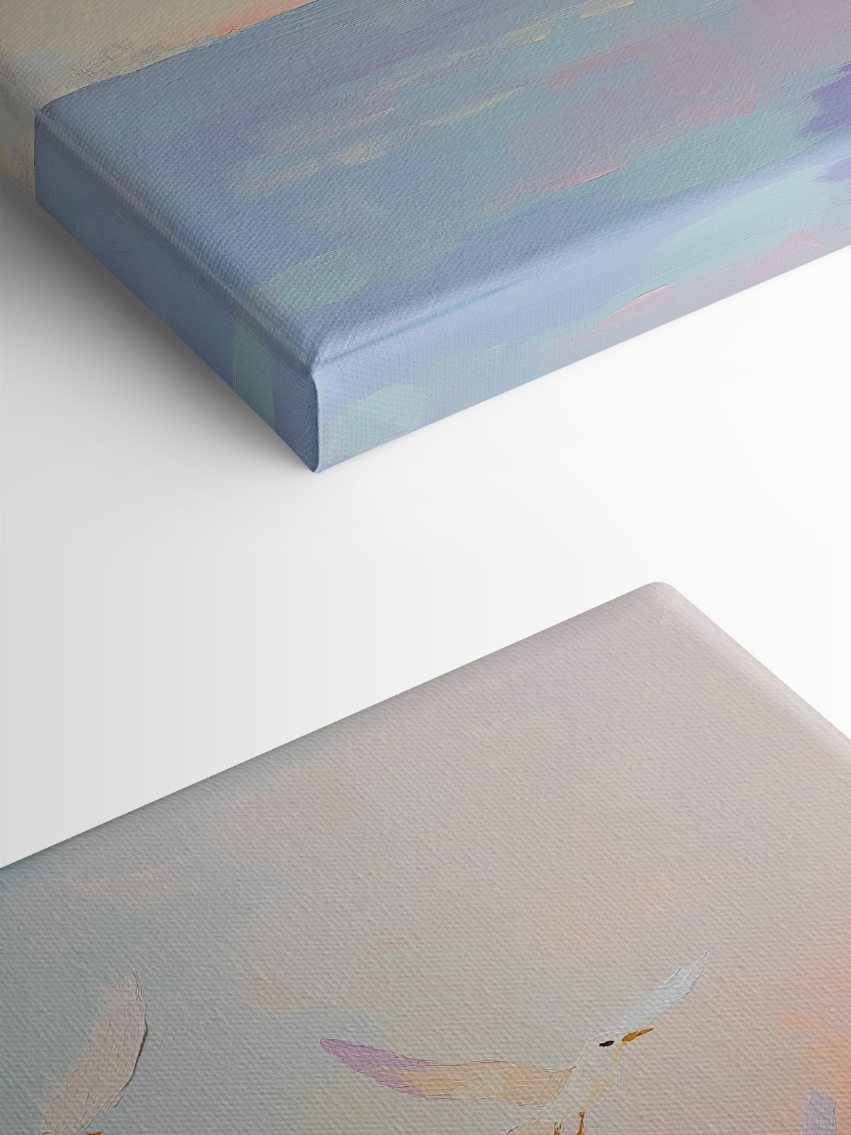 Stel je dit eens voor: vogels die sierlijk door een dromerige schemerhemel vliegen, hun vleugels beroeren het pastelkleurige water eronder. Deze canvasprint is als een frisse wind voor je muren – perfect voor een ruimte die hunkert naar een beetje sereniteit met een vleugje eigenzinnigheid. Het is alsof je een magisch moment vangt, vlak voordat de zee geheimen fluistert tegen de ondergaande zon. Hang het op en plotseling voelt je kamer als een gezellig uitje aan zee. Het is kunst die je doet stilstaan, glimlachen en misschien wensen dat je ook kon vliegen.