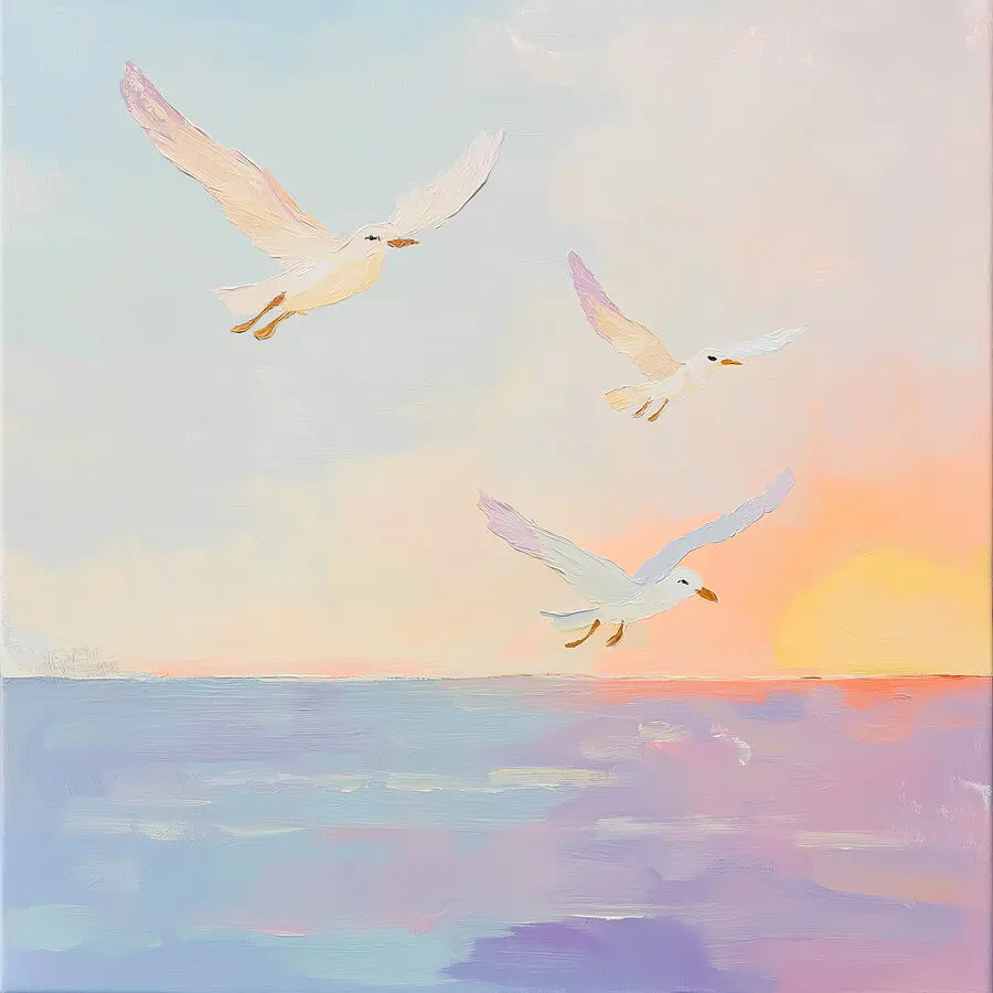 Stel je dit eens voor: vogels die sierlijk door een dromerige schemerhemel vliegen, hun vleugels beroeren het pastelkleurige water eronder. Deze canvasprint is als een frisse wind voor je muren – perfect voor een ruimte die hunkert naar een beetje sereniteit met een vleugje eigenzinnigheid. Het is alsof je een magisch moment vangt, vlak voordat de zee geheimen fluistert tegen de ondergaande zon. Hang het op en plotseling voelt je kamer als een gezellig uitje aan zee. Het is kunst die je doet stilstaan, glimlachen en misschien wensen dat je ook kon vliegen.