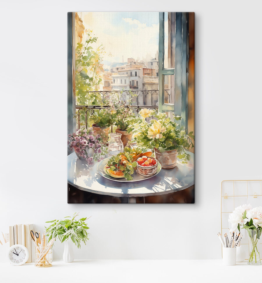 Stel je dit eens voor: een luie zondagochtend met je koffie en dit levendige canvas aan de muur. Het is alsof je een charmant klein café binnenstapt, met zonlicht dat door het raam op een tafel valt die barst van de waterverfbloemen en vruchten. Perfect om leven en kleur te blazen in elke kamer – zie het als een mini-ontsnapping elke keer dat je een blik op het doek werpt. De details voelen bijna tastbaar aan, alsof je een sappige vrucht zo van het bord kunt plukken. Een echte gespreksstarter die doet dromen van gezellige middagen en artistieke avonturen.