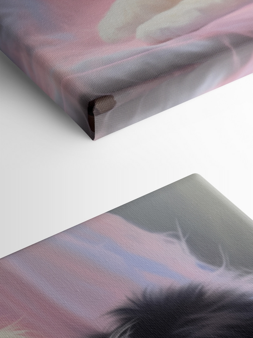 Deze charmante canvasprint van een zwart-witte kat die ligt te luieren op een pluizige roze deken is puur genot. Stel je deze katachtige vriend voor die rustig jouw dagelijkse capriolen observeert met die brede, nieuwsgierige ogen. Het geeft een gezellige, speelse sfeer die elke kamer onmiddellijk kan opfleuren. Perfect voor het hoekje van een kattenliefhebber of een kinderkamer. Misschien moedigt het zelfs wat speelgoedmuisjes aan om te komen spelen! De zachte kleuren en ingewikkelde details creëren een warme sfeer, die uitnodigt tot knuffels en zachte momenten. Het is net alsof je een stukje vredige rust aan je muur hebt hangen!