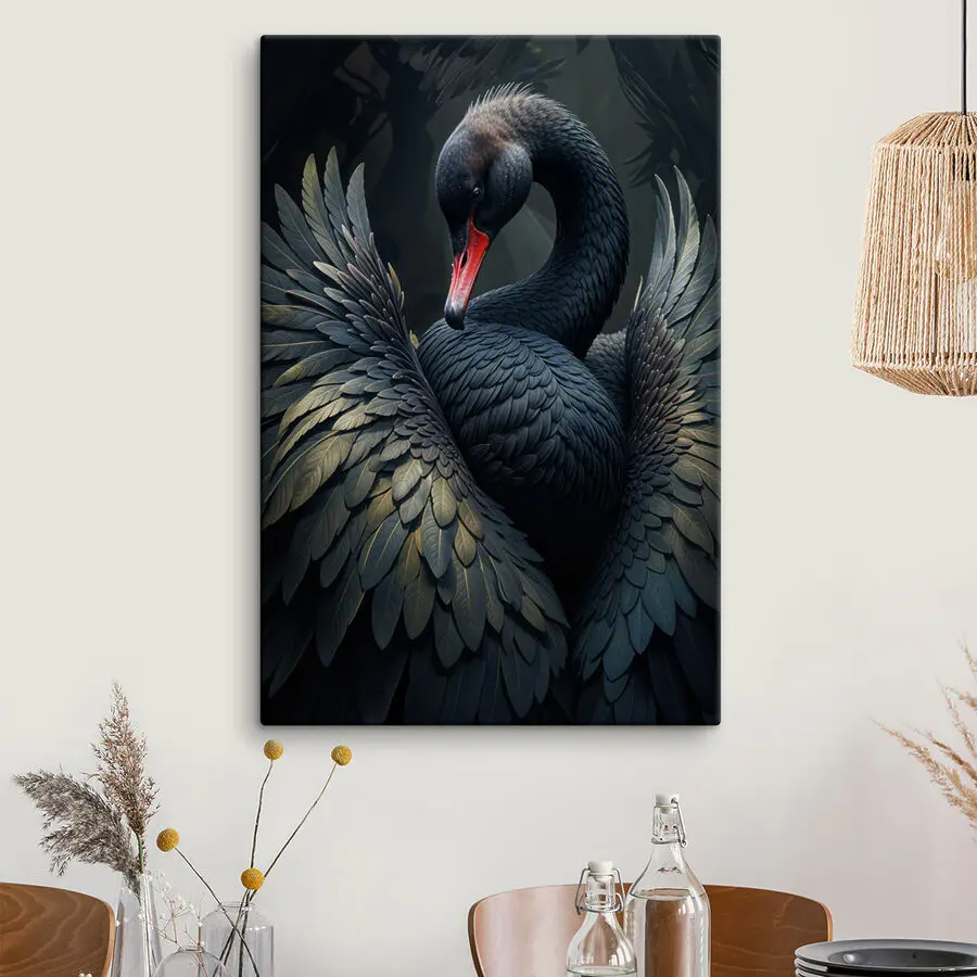 Transformeer je ruimte met de prachtige “Canvas Schilderijen Zwarte Zwaan met Rode Snavel”. Dit stuk is niet zomaar een decoratie; het is een statement. Stel je voor: een prachtige zwarte zwaan met een rode snavel, sierlijk poserend tussen bladeren die tot leven lijken te komen. Het is alsof hij je uitnodigt voor een gesprek over de elegantie van de natuur.