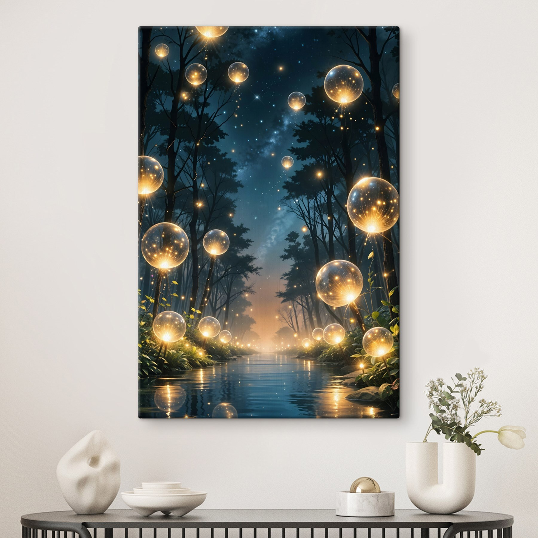 Stap in een wereld waar gloeiende bubbels tussen de bomen dansen en een grillige ontsnapping creëren. Deze canvasprint, “Glowing Bubbles in a Forest”, nodigt je uit om je een rustige avondwandeling voor te stellen, waarbij de zachte geluiden van de natuur zich mengen met de zachte gloed om je heen. Het voelt als een sprookje dat zich in je woonkamer ontvouwt. De aquareltinten omhullen je met warmte, waardoor elke ruimte uitnodigend aanvoelt. Perfect voor wie houdt van de charme van de natuur of gewoon een beetje wil dagdromen. Hang het op en laat je muren spreken – misschien vragen gasten wel of het een geheime poort is!