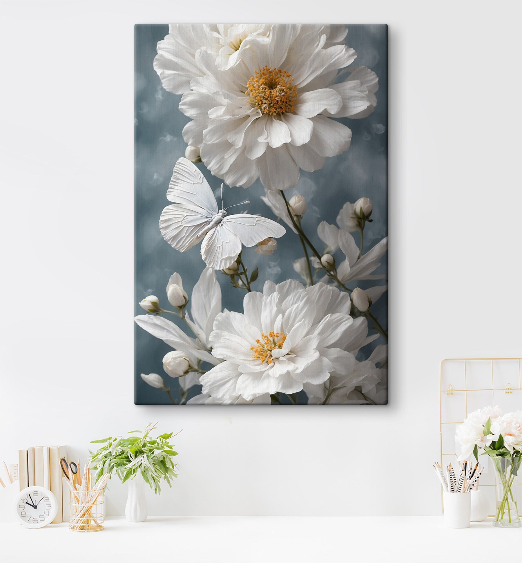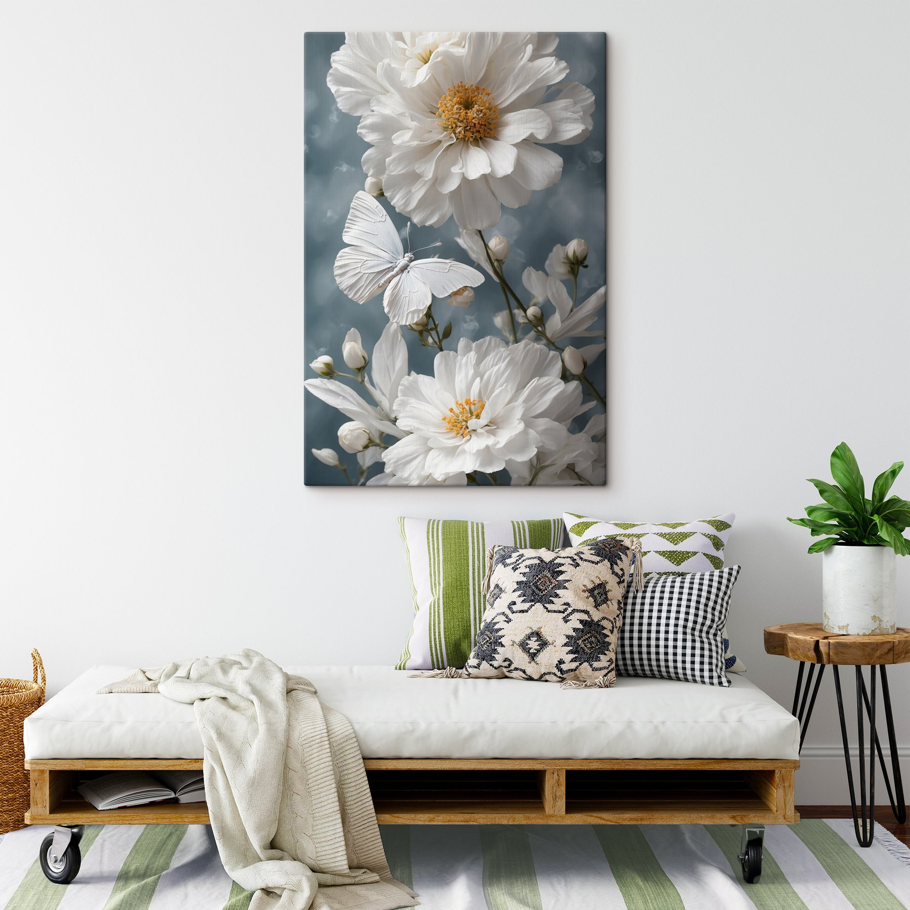 Verander elke muur in een stukje natuur met deze betoverende canvasprint met een delicate vlinder op zachte bloemen. Het is alsof je een stukje van de natuur in huis haalt. Zie het voor je in een knusse leeshoek: lekker wegkruipen met een goed boek en de zachte kleuren creëren een serene sfeer om je heen. Vrienden zullen het bewonderen en je hebt genoeg kansen om die leuke vlinderfeitjes te vermelden op bijeenkomsten. Deze vlinder is ideaal om een rustig en vrolijk tintje aan elke ruimte te geven en straalt moeiteloos elegantie uit zonder het te proberen. Perfect voor bloemenliefhebbers – dit stuk zal zeker inspireren tot dagdromen en een glimlach.