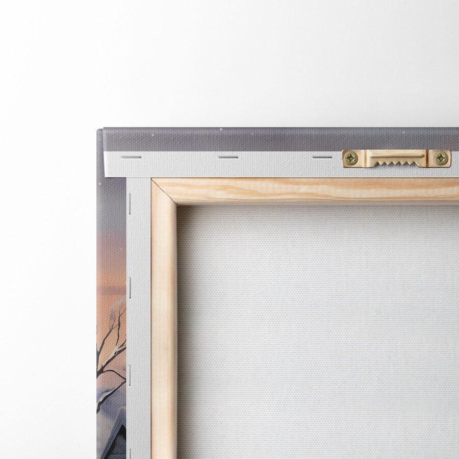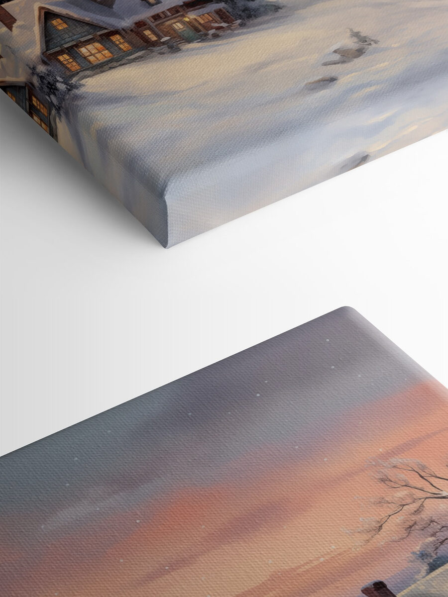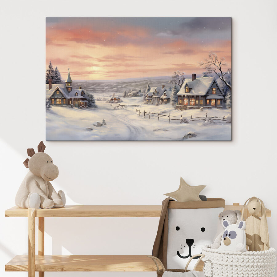 Stel je voor dat je in een gezellige stoel wegzakt, met een mok warme chocolademelk in de hand, terwijl je naar een besneeuwde dorpsscène staart die rechtstreeks uit een winterwonderland lijkt te komen. Deze canvasprint legt een sereen moment vast waarop de huizen, bedekt met pluizige sneeuw, verhalen lijken te vertellen over warme vuren en vakantievreugde. De zachte tinten van de zonsondergang achter de bergtoppen schetsen een beeld van rust. Elk detail nodigt uit tot dagdromen over het drinken van gekruide cider of het bouwen van een sneeuwpop. Het is alsof je een vleugje van de kilte en charme van de natuur in huis haalt, perfect om warmte toe te voegen aan elke muur. Wie wil er geen dagelijkse herinnering aan zulke vredige schoonheid?