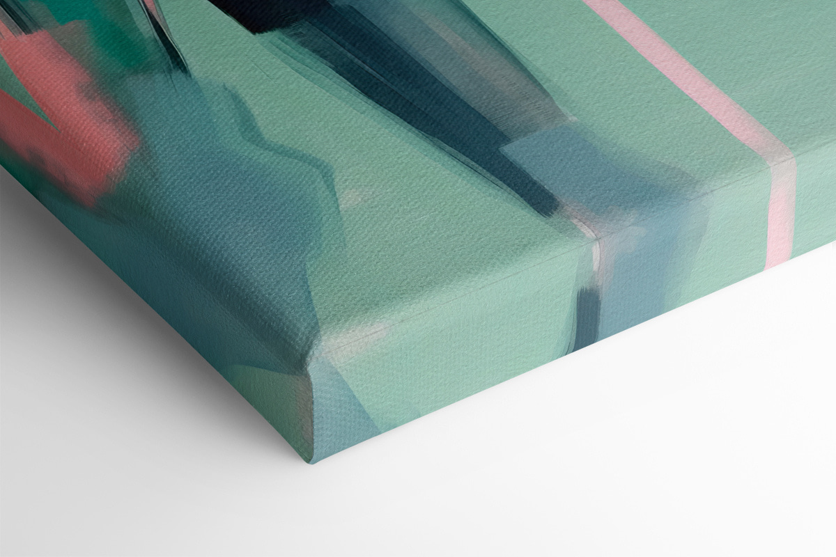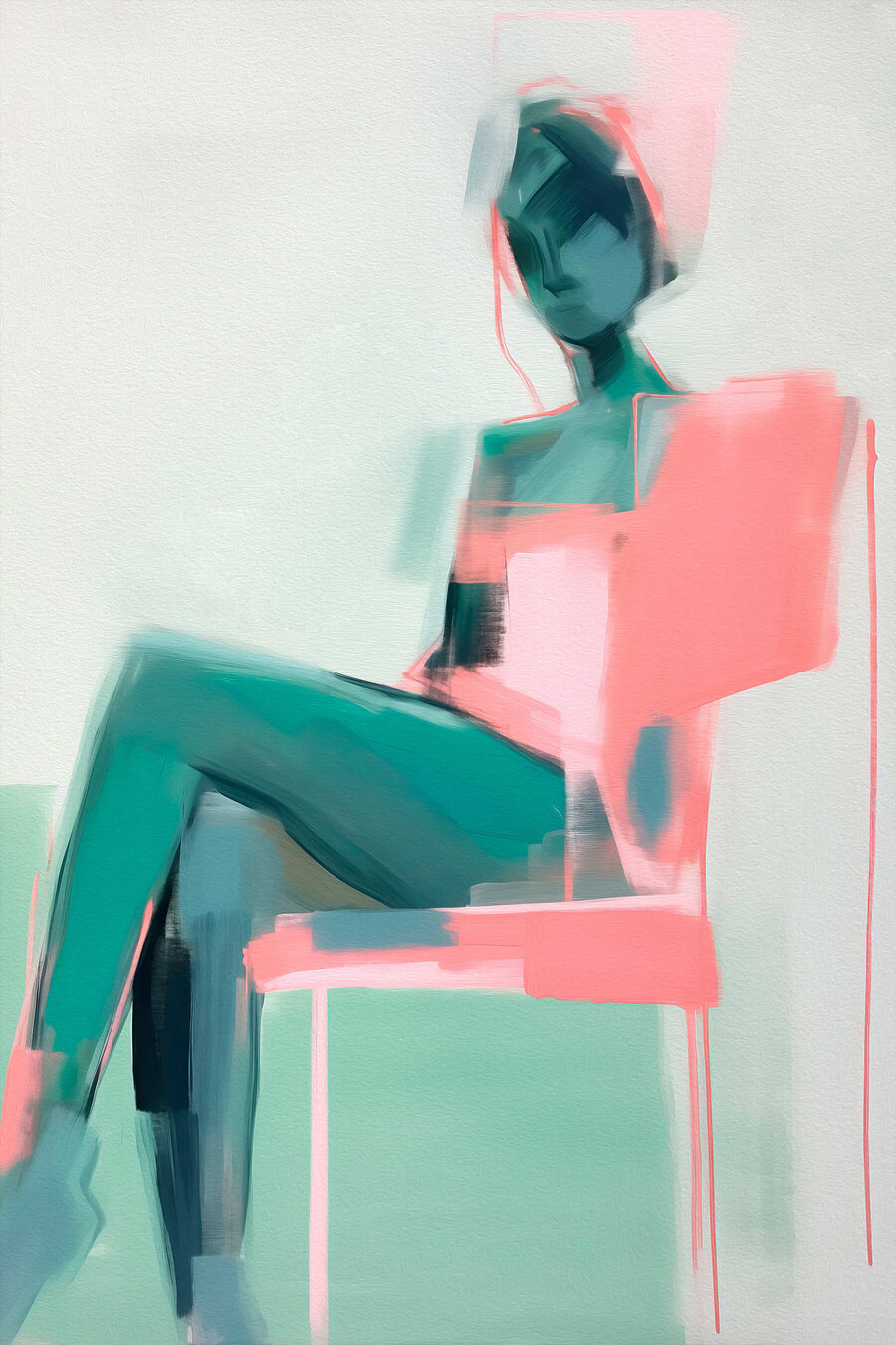 Stel je voor dat deze levendige canvasprint een gezellig hoekje in je huis verlicht. Op het doek zit een vrouw in een stoel en straalt rust en een vleugje mysterie uit. De speelse penseelstreken vermengen dromerige tinten groenblauw en zachtroze en geven een artistieke uitstraling die zowel modern als tijdloos aanvoelt. Dit stuk siert niet alleen een muur, het brengt gesprekken op gang. Stel je voor dat je koffie drinkt, ernaar staart en je geïnspireerd voelt door haar ontspannen houding. Het is de perfecte touch voor iedereen die houdt van unieke kunst die een statement maakt. Voeg een vleugje kleur en persoonlijkheid toe aan je interieur met deze prachtige print!