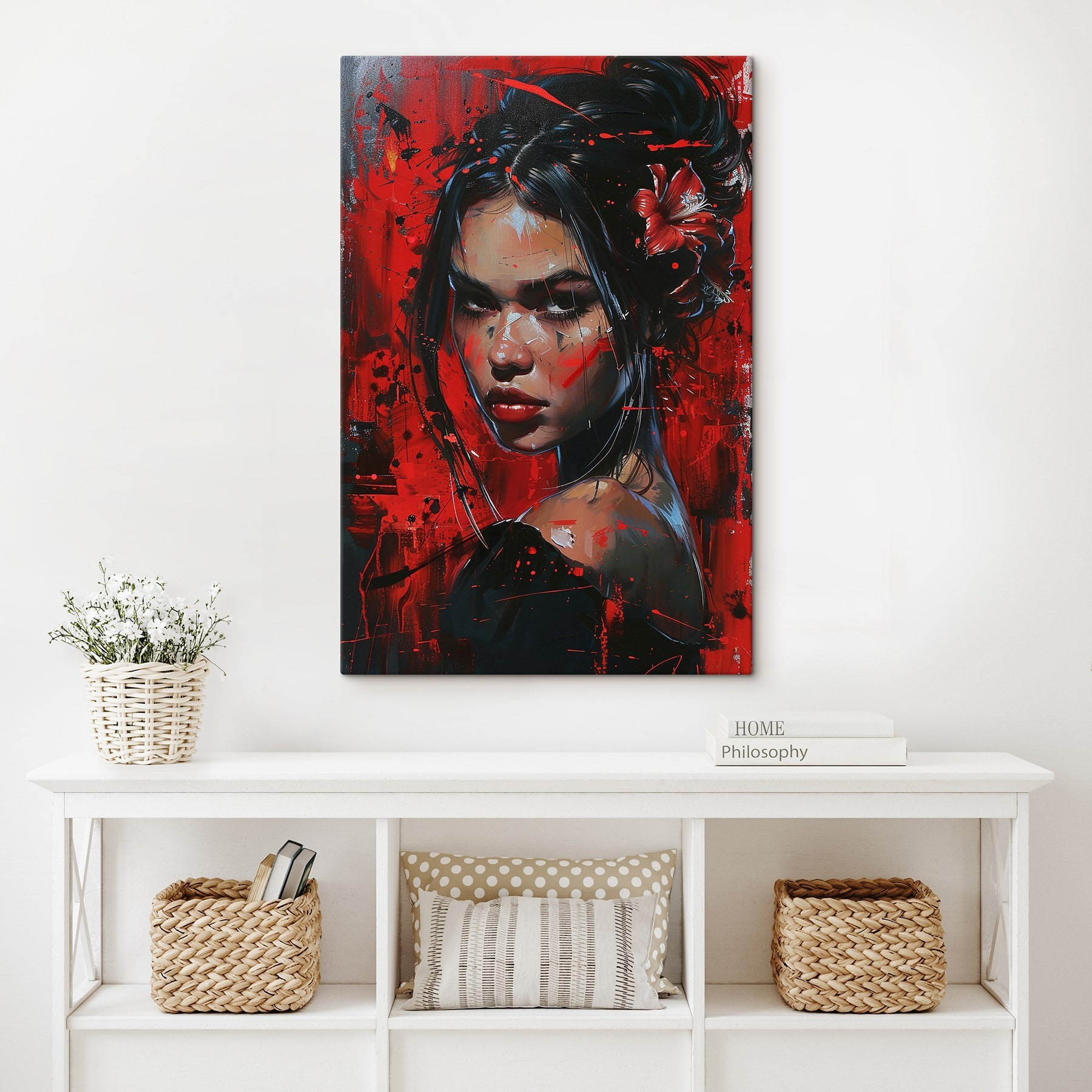 Duik in de gedurfde energie van deze canvasprint met een opvallende vrouw tegen een vurige achtergrond van rode verf. Het is alsof ze rechtstreeks uit de droom van een kunstenaar komt en emotie en diepte uitstraalt. Stel je voor dat dit werk in een gezellige hoek hangt. Het is het soort kunst dat gesprekken op gang brengt, nietwaar? Vrienden zullen zich aangetrokken voelen tot de levendige kleuren en het verhaal achter die beklemmende blik. Het geeft elke ruimte een levendig gevoel, alsof het creativiteit ademt. Perfect om een woonkamer of kantoor een vleugje persoonlijkheid te geven, het is niet zomaar decoratie, het is een stemming. Echt, wie zou zijn ruimte niet willen delen met zo’n woeste schoonheid?