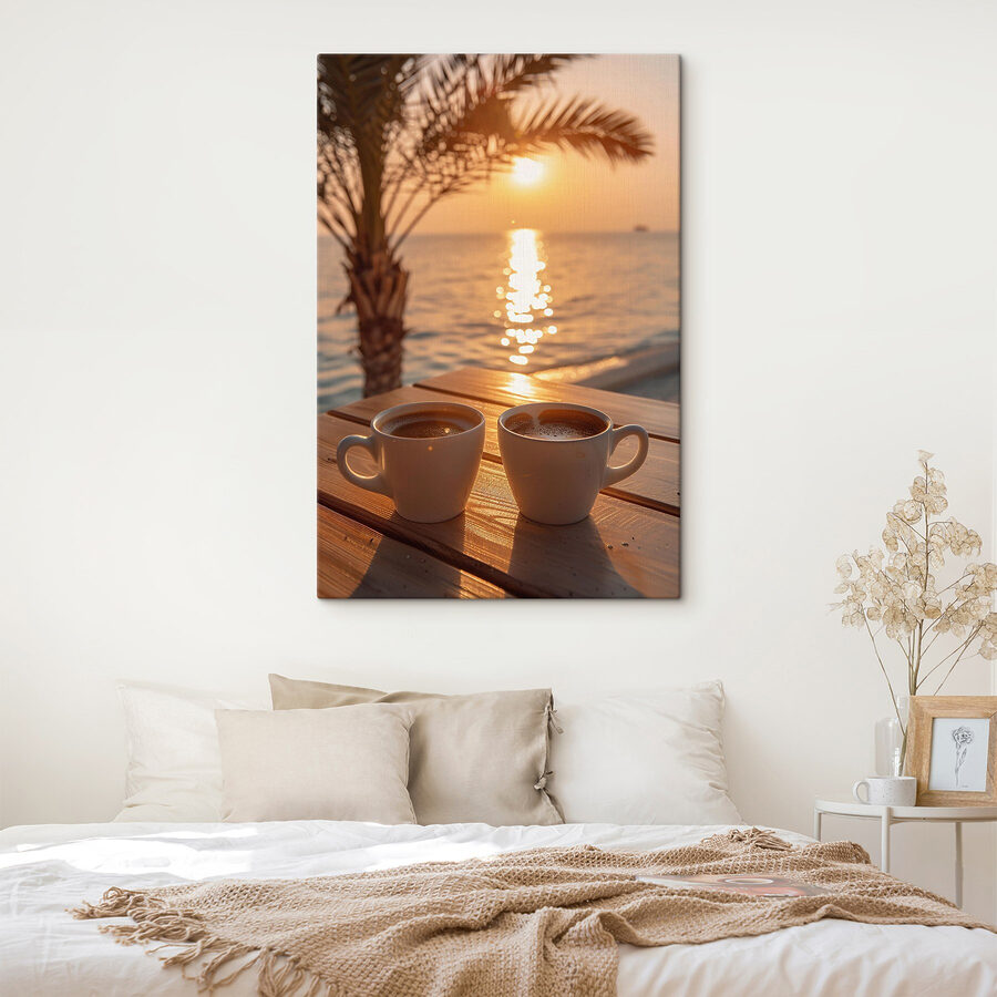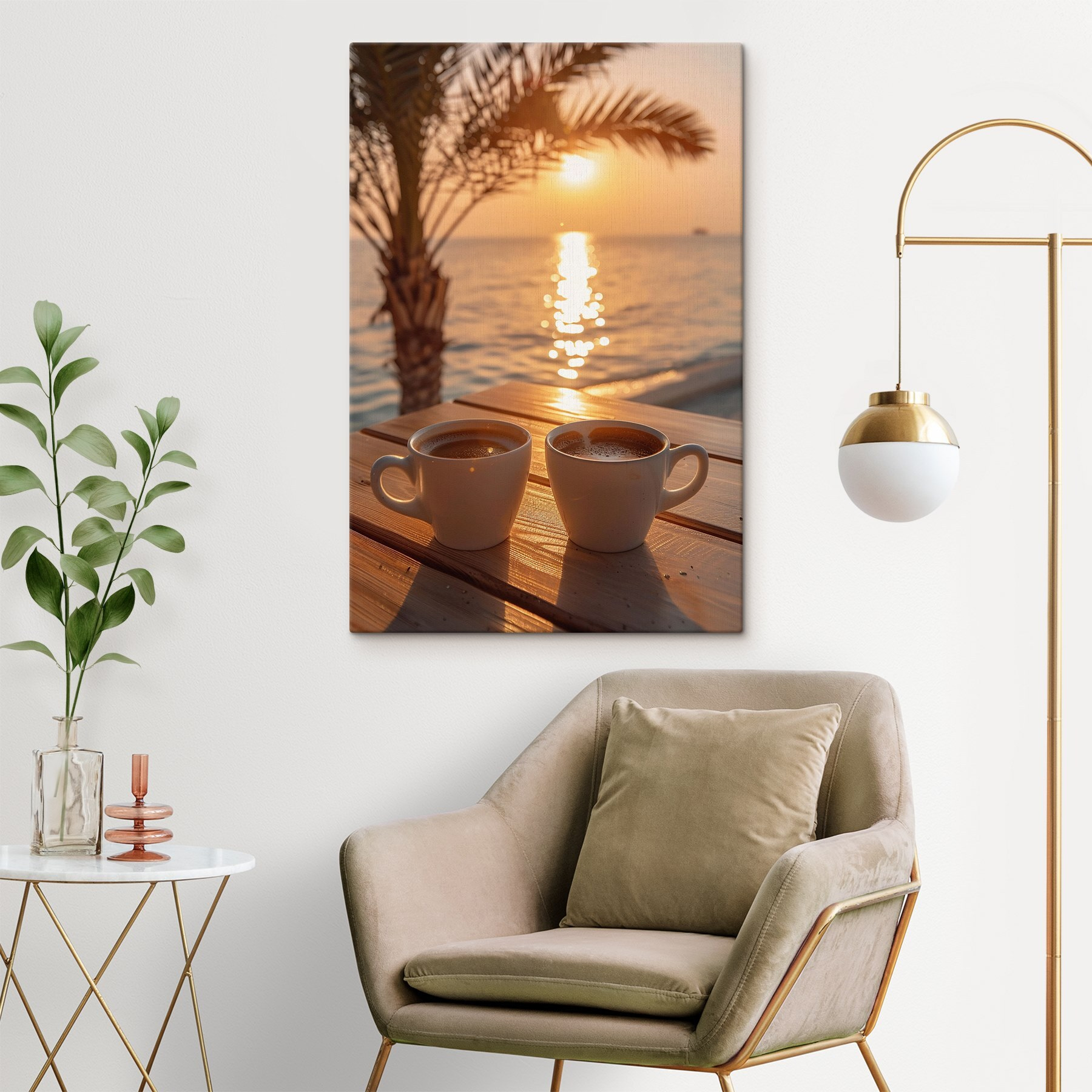 Stel je voor dat je wakker wordt met de zachte gloed van een zonsopgang over de oceaan en twee dampende kopjes koffie die klaarstaan om te worden genuttigd. Deze canvasprint legt dat perfecte moment van rust vast, waarop de tijd lijkt te vertragen. Het is alsof je een minivakantie aan je muur hebt hangen, die uitnodigt tot ontspannen babbelen of rustgevende ochtendrituelen. De zachte reflecties op het water voegen een dromerige sfeer toe, waardoor elke ruimte gezellig en gastvrij aanvoelt. Perfect voor koffieliefhebbers of iedereen die thuis een serene sfeer wil creëren. Wie zou er niet wat langer in dat tafereel willen blijven hangen?