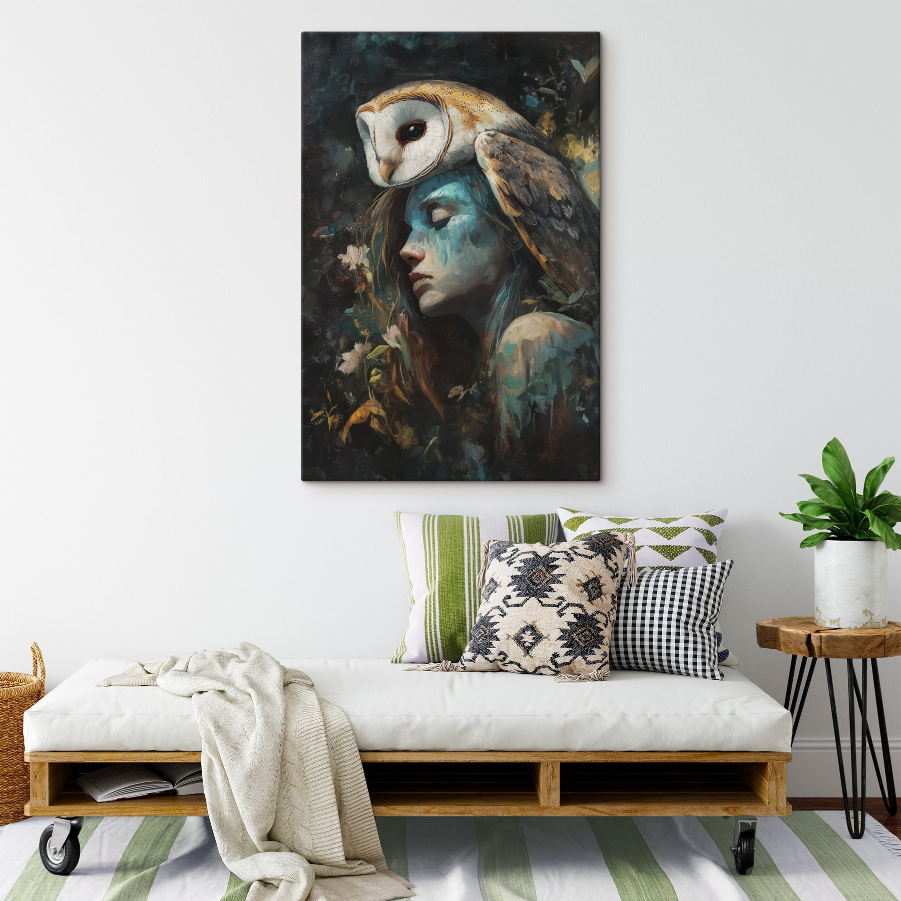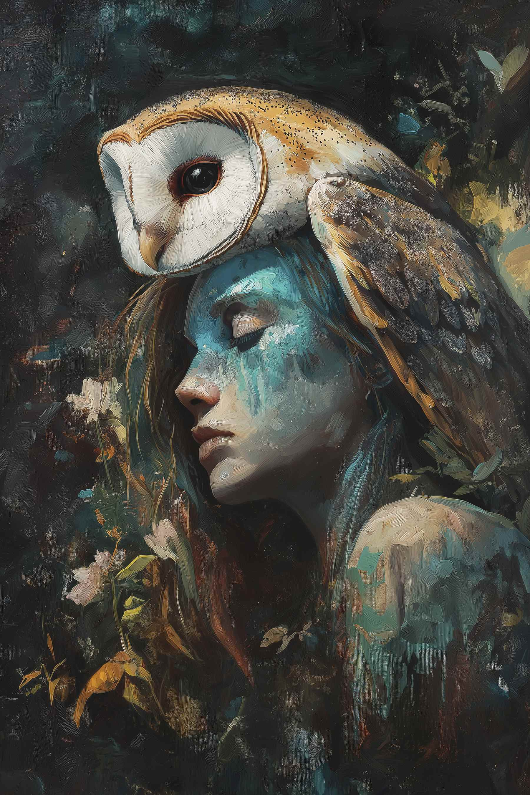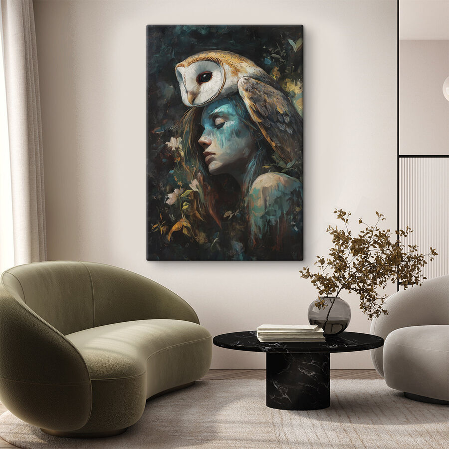 Duik in een wereld waar de natuur de hoofdrol speelt met deze betoverende canvasprint. Een vrouw leunt sereen, een uil zit vorstelijk op haar hoofd – over vrienden dichtbij houden gesproken, en je harige vriendjes nog dichterbij! Dit kunstwerk barst van de kleur en emotie en hult je ruimte in een gezellige omhelzing. Elke blik erop kan een beetje dagdromen opwekken, en misschien zelfs inspireren tot een of twee grillige verhalen. Deze print is perfect om een woonkamer of een rustig leeshoekje een vleugje magie te geven en nodigt uit tot een gevoel van rust en verwondering. Hoe kun je je niet een beetje levendiger voelen met een stuk als dit in de buurt?