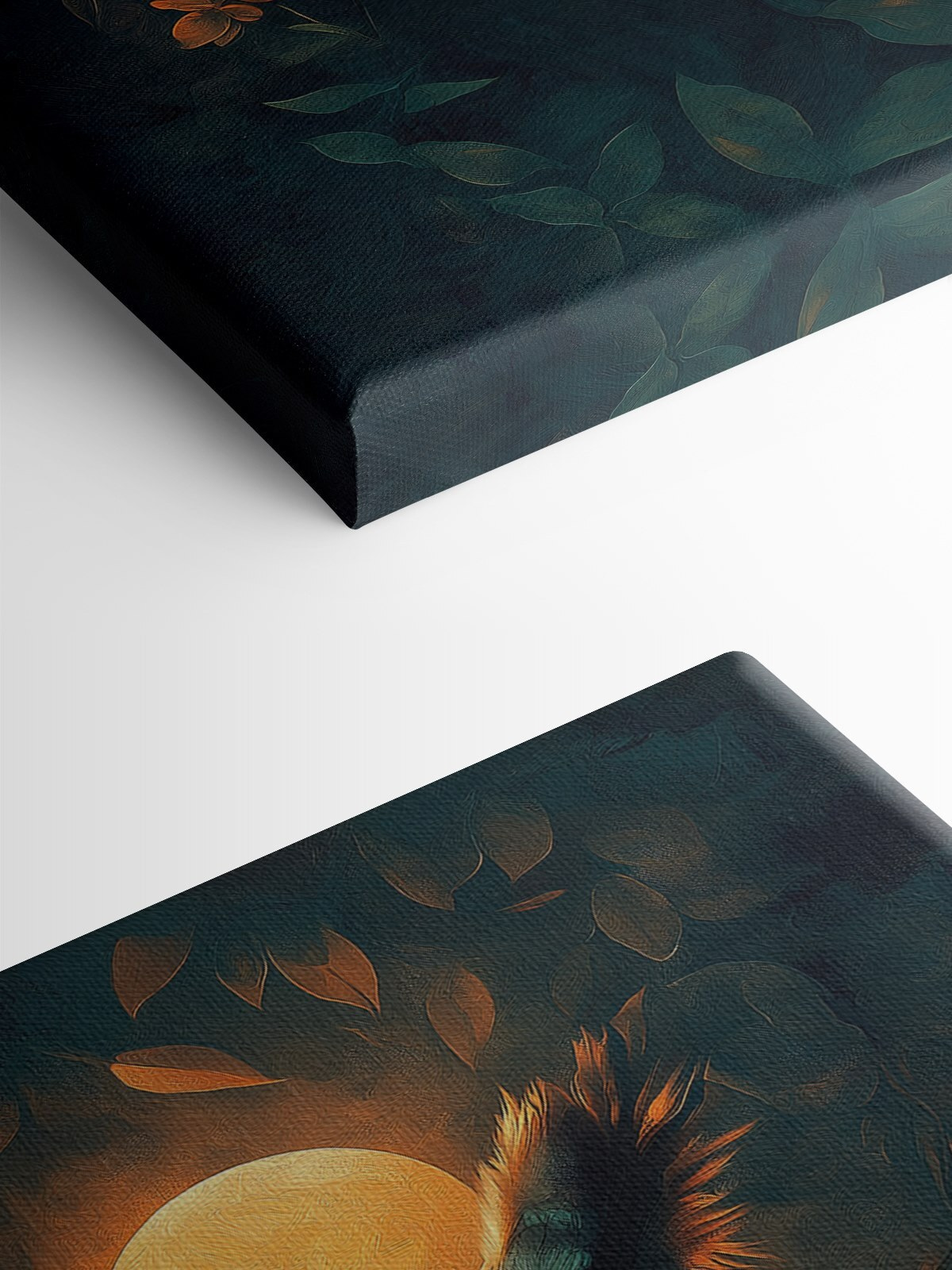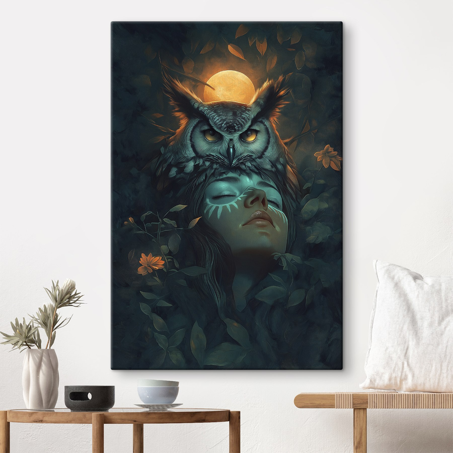 Stap in een wereld waar natuur en fantasie samenkomen met deze prachtige canvasprint. Stel je een serene vrouw voor, met gesloten ogen, volmaakt in vrede. Een uil, majestueus en wijs, zit bovenop haar hoofd en geeft haar een charmante, eigenzinnige uitstraling. De rijke kleuren en zachte motieven trekken je mee de diepte in van een middernachtelijk bos, waar gefluister van bladeren uitnodigt tot dagdromen. Dit stuk hangt niet alleen aan de muur, het transformeert een ruimte. Perfect voor een knus hoekje of een stoer statement in de woonkamer, het wakkert gesprekken aan en geeft gasten een reden om te glimlachen. Wie houdt er niet van een beetje eigenzinnigheid in zijn inrichting?