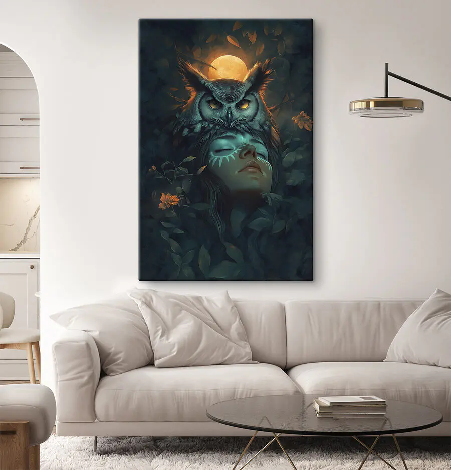 Stap in een wereld waar natuur en fantasie samenkomen met deze prachtige canvasprint. Stel je een serene vrouw voor, met gesloten ogen, volmaakt in vrede. Een uil, majestueus en wijs, zit bovenop haar hoofd en geeft haar een charmante, eigenzinnige uitstraling. De rijke kleuren en zachte motieven trekken je mee de diepte in van een middernachtelijk bos, waar gefluister van bladeren uitnodigt tot dagdromen. Dit stuk hangt niet alleen aan de muur, het transformeert een ruimte. Perfect voor een knus hoekje of een stoer statement in de woonkamer, het wakkert gesprekken aan en geeft gasten een reden om te glimlachen. Wie houdt er niet van een beetje eigenzinnigheid in zijn inrichting?