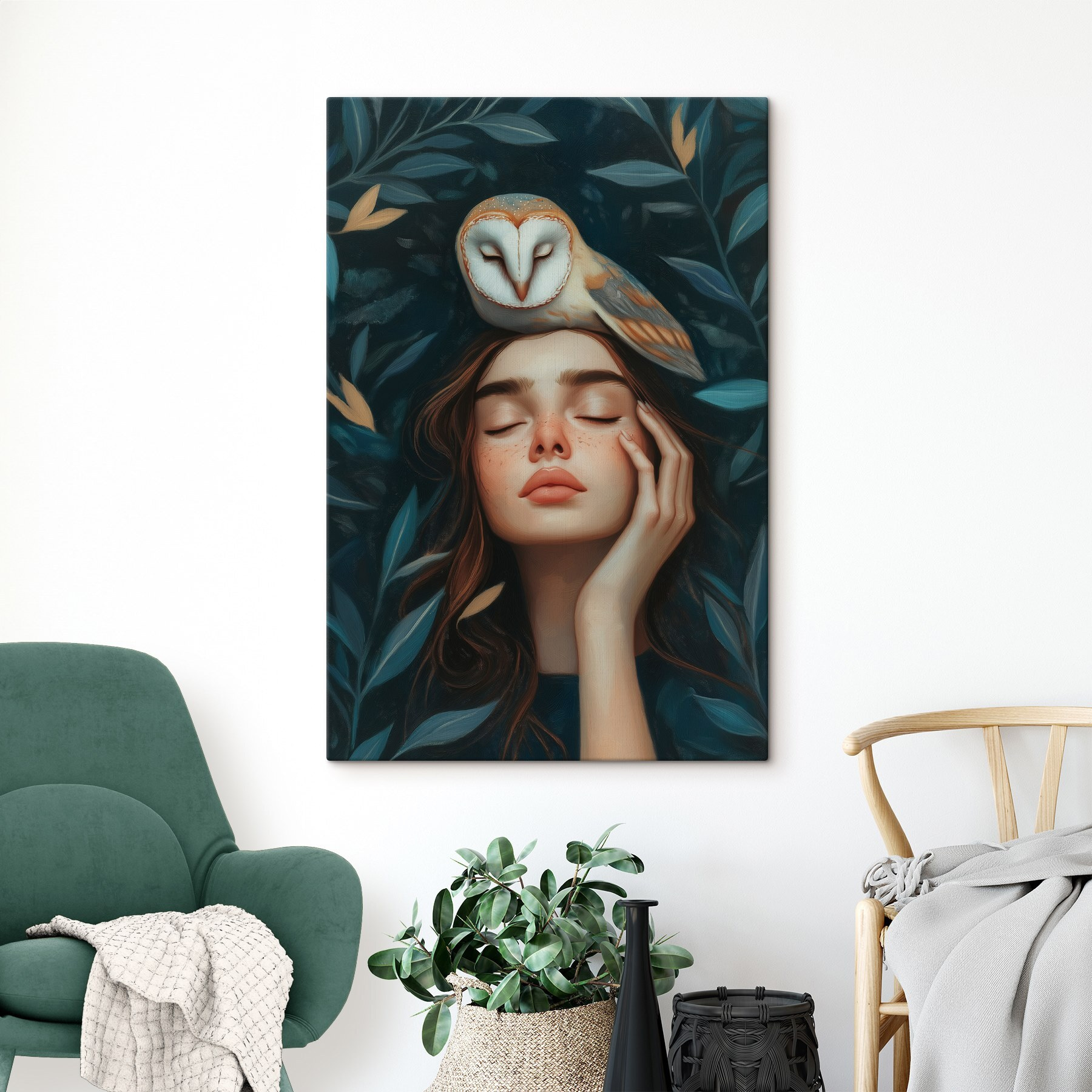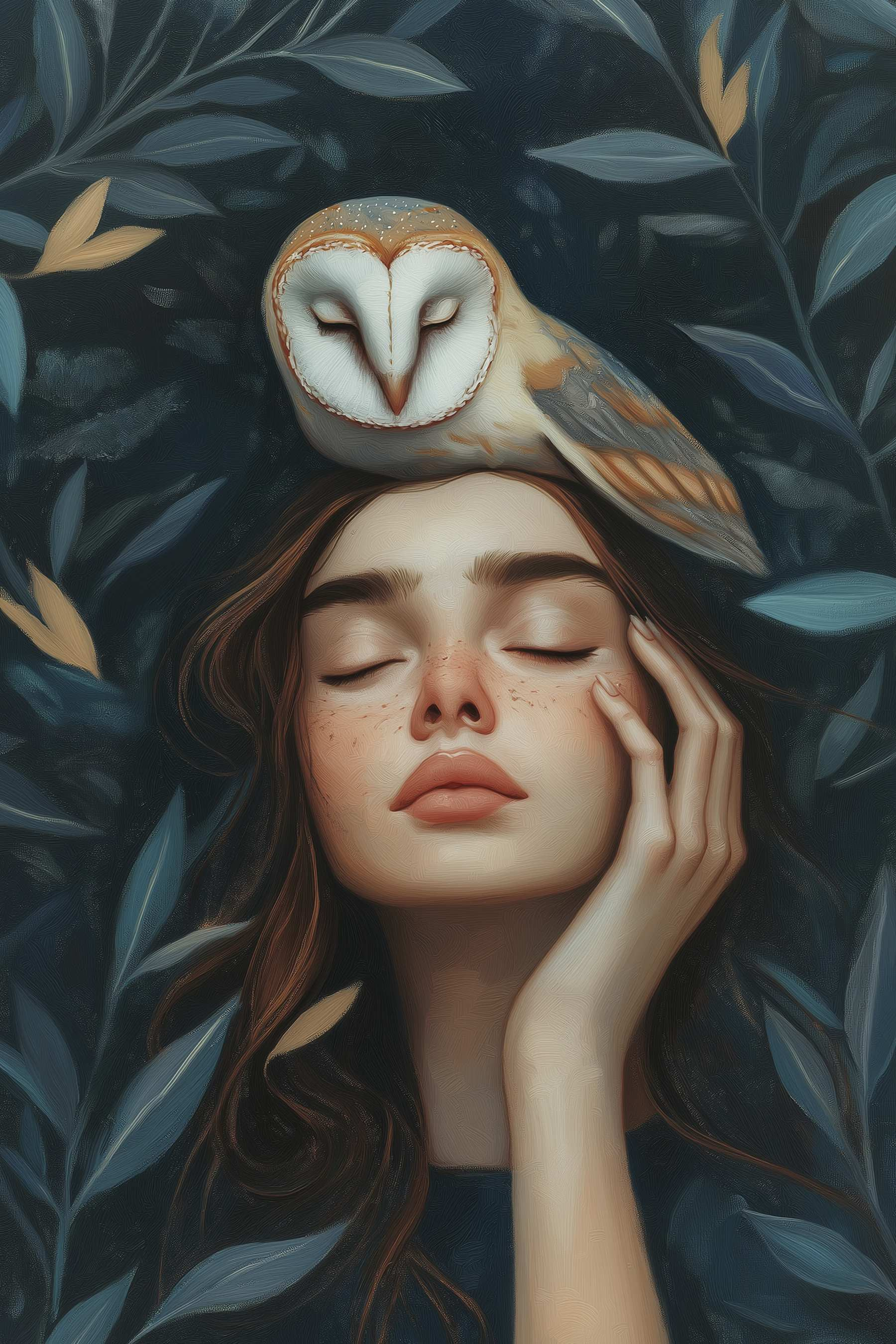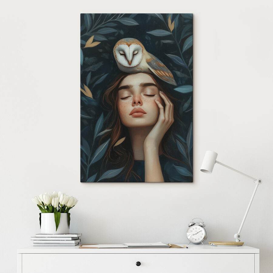 Fluisterend van de natuur en wijsheid vangt een sereen moment dat voelt als een zachte knuffel voor je muren. Stel je voor: een kalm gezicht rustend onder een wijze uil, omringd door weelderige bladeren. Het is bijna alsof de natuur haar geheimen met je deelt, als een intiem gesprek tijdens een vredige middag.
