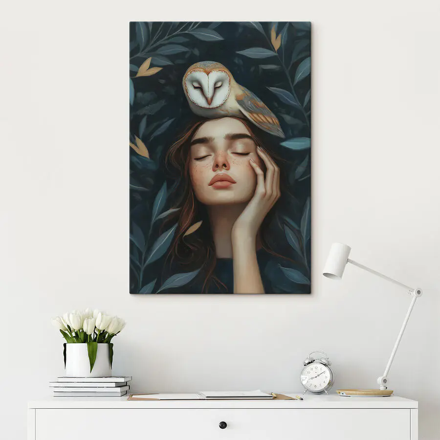 Fluisterend van de natuur en wijsheid vangt een sereen moment dat voelt als een zachte knuffel voor je muren. Stel je voor: een kalm gezicht rustend onder een wijze uil, omringd door weelderige bladeren. Het is bijna alsof de natuur haar geheimen met je deelt, als een intiem gesprek tijdens een vredige middag.