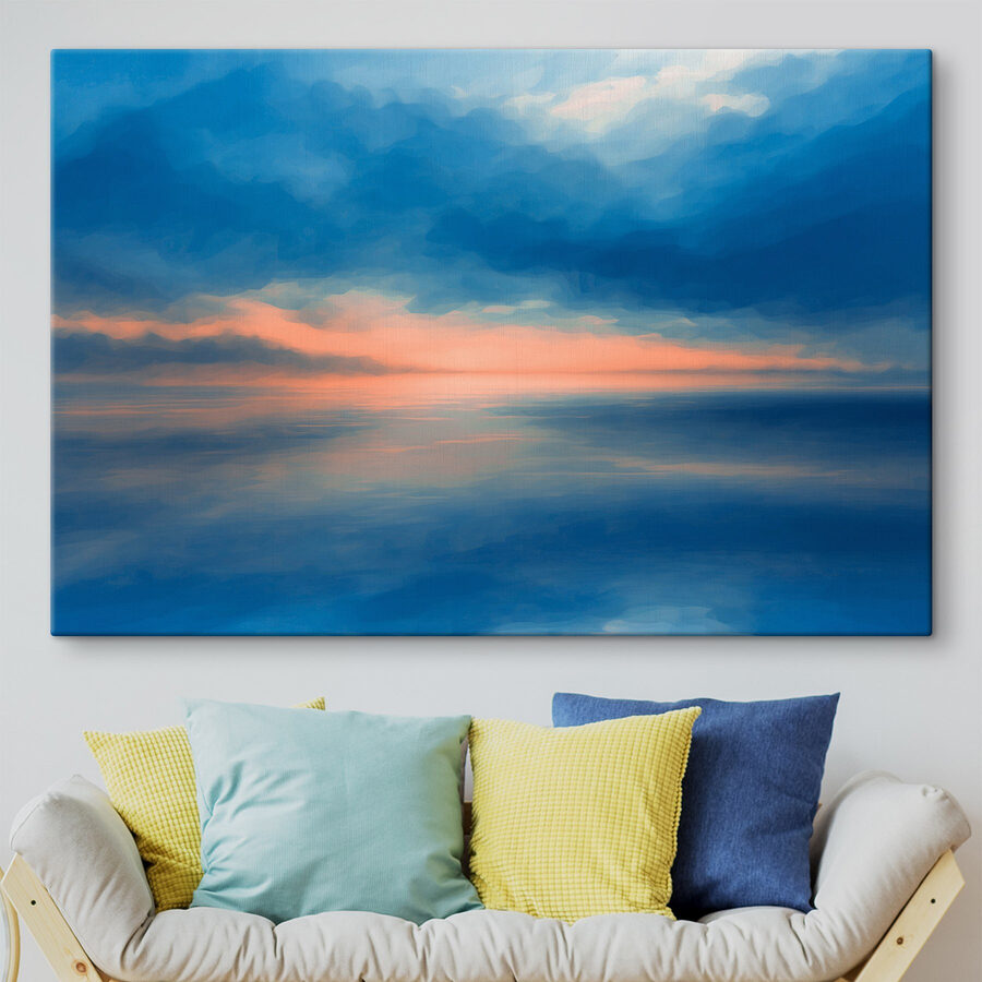 Transformeer je kamer met deze prachtige canvasprint met een betoverende blauwe en oranje lucht vol wolken. Stel je voor dat je na een lange dag thuiskomt, in je favoriete stoel wegzakt en je door dit levendige stuk laat meevoeren naar een zonsondergang. Het is alsof je een minivakantie aan je muur hebt hangen! De rustgevende kleuren doen je denken aan rustige stranddagen of luie wandelingen bij zonsondergang aan de kust. Of het nu in een gezellige woonkamer staat of in een serene slaapkamer, het zal zeker vreugde en gespreksstof oproepen – perfect voor diegenen die de schoonheid van de natuur thuis waarderen!