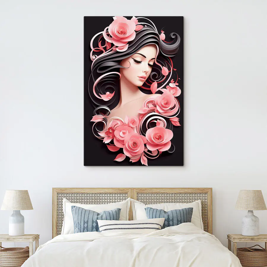 Transformeer je ruimte met deze fascinerende canvasprint met een vrouw getooid met delicate roze bloemen. Het ingewikkelde ontwerp trekt je naar binnen, met vloeiend haar en bloeiende bloemblaadjes die geheimen van de natuur lijken te fluisteren. Stel je voor dat je deze schoonheid ophangt in een gezellig hoekje waar het zonlicht eroverheen danst en een warmte creëert die aanvoelt als een knuffel. Het is meer dan een decorstuk; het brengt gesprekken op gang en zorgt voor een glimlach. Stel je een regenachtige dag voor: deze print doet je denken aan lentebloesems en maakt elke blik een beetje vrolijker. Perfect voor wie hunkert naar een vleugje eigenzinnigheid en elegantie!