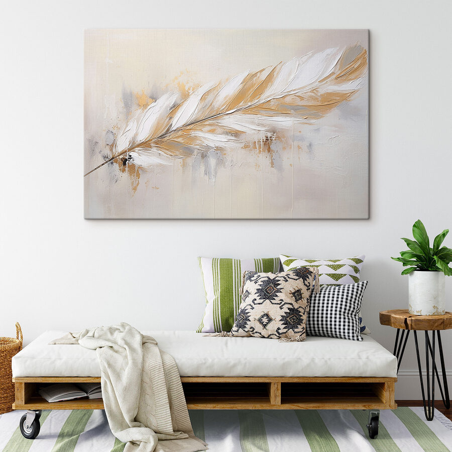Tover elke ruimte om in een gezellig toevluchtsoord met deze prachtige canvasprint met een delicate veer tegen een zachte achtergrond. Het is als een fluistering van de natuur binnenshuis, perfect voor die momenten waarop je even wilt bijkomen en genieten van de schoonheid om je heen. Stel je hem voor in een zonovergoten leeshoekje, waar hij kan mijmeren over je boekenkeuzes. De eenvoud van het ontwerp geeft de kamer een kalme sfeer, die zorgen wegneemt en wegvliegt – kon het echte leven maar hetzelfde doen. Een vleugje natuur zonder het gedoe van planten water geven? Ja, graag!