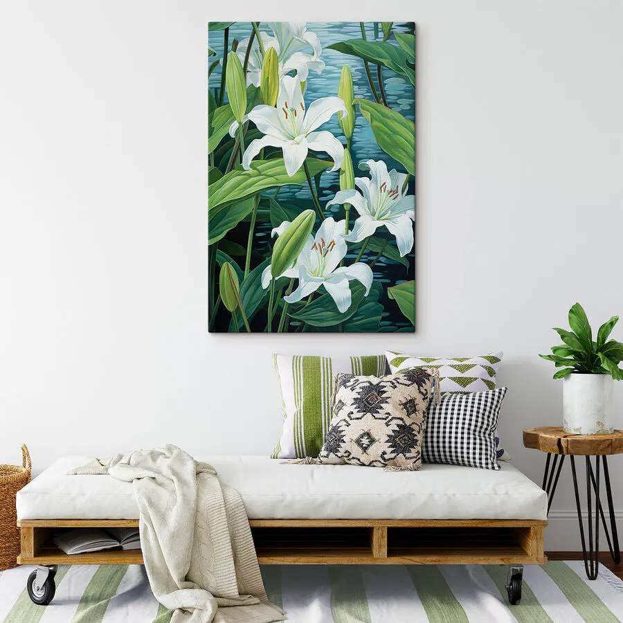 Verander elke ruimte in een serene oase met “Delicate Lilies in Serene Waters”. Stel je die prachtige witte lelies voor die zachtjes drijven op rustig water – het is net een kunstwerk van de natuur aan je muur! Deze canvasprint is niet alleen decoratief, het is een verademing. Stel je voor dat je lekker gaat zitten met een kopje thee, naar deze bloemen staart en de vredige sfeer over je heen voelt komen. Perfect voor een woonkamer, slaapkamer of zelfs die ene muur die altijd een beetje te kaal lijkt. Het is een gespreksstarter, een dagdromer en ja, een instant humeurversterker! Wie wil dat nou niet?