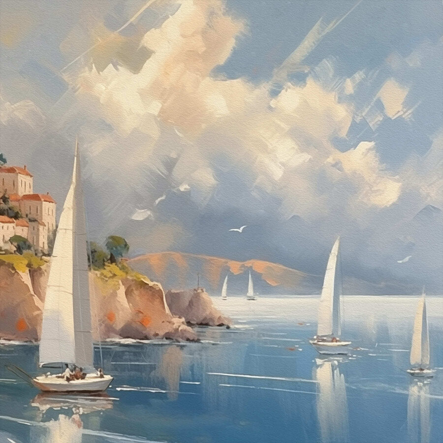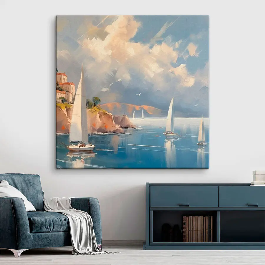 Stel je een serene dag aan het water voor, waar zeilboten moeiteloos over een glinsterend oppervlak glijden. Dit canvas kunstwerk legt precies dat vast – het is als een klein venster naar rust. De zachte kleuren mengen prachtig, waardoor het perfect is voor elke ruimte die een knusse touch nodig heeft. Hang het in een woonkamer en het zou wel eens dagdromen over een vakantie aan zee kunnen opwekken. De zachte beweging van de zeilen en de adembenemende wolken boven je hoofd nodigen uit tot kalmte in je huis. Eerlijk gezegd, wie zou zich niet een beetje meer ontspannen voelen als hij hiernaar staart? Het is alsof je elke dag een minivakantie hebt.