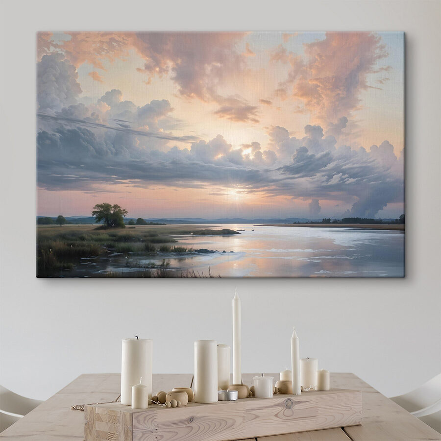 Deze prachtige canvasprint toont een sereen waterlichaam gekust door zachte golven en een majestueuze boom, allemaal onder een hemel gedrapeerd met dromerige wolken. Stel je voor dat je elke ochtend wakker wordt met dit uitzicht – het voelt als een uitnodiging om diep adem te halen en de schoonheid van de natuur in je op te nemen. Dit stuk is niet zomaar kunst; het is een stukje rust, perfect voor elke muur die smeekt om een vleugje persoonlijkheid. Of het nu een gezellige woonkamer opfleurt of een kantoor aan huis voorziet van een vleugje rust, het fluistert verhalen van vredige middagen aan het water. En misschien laat het bezoekers wel even stilstaan en zeggen: “Wow, waar heb je dat vandaan?”. Het is net alsof je thuis je eigen kleine ontsnapping hebt!