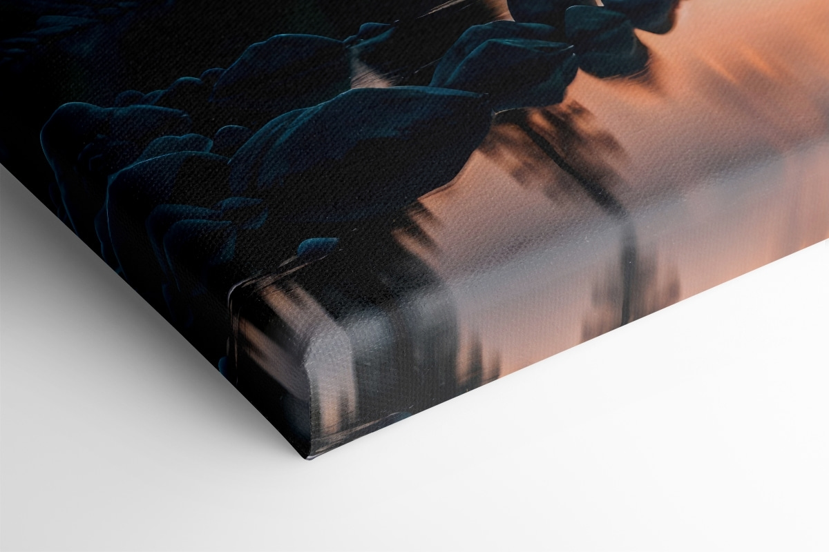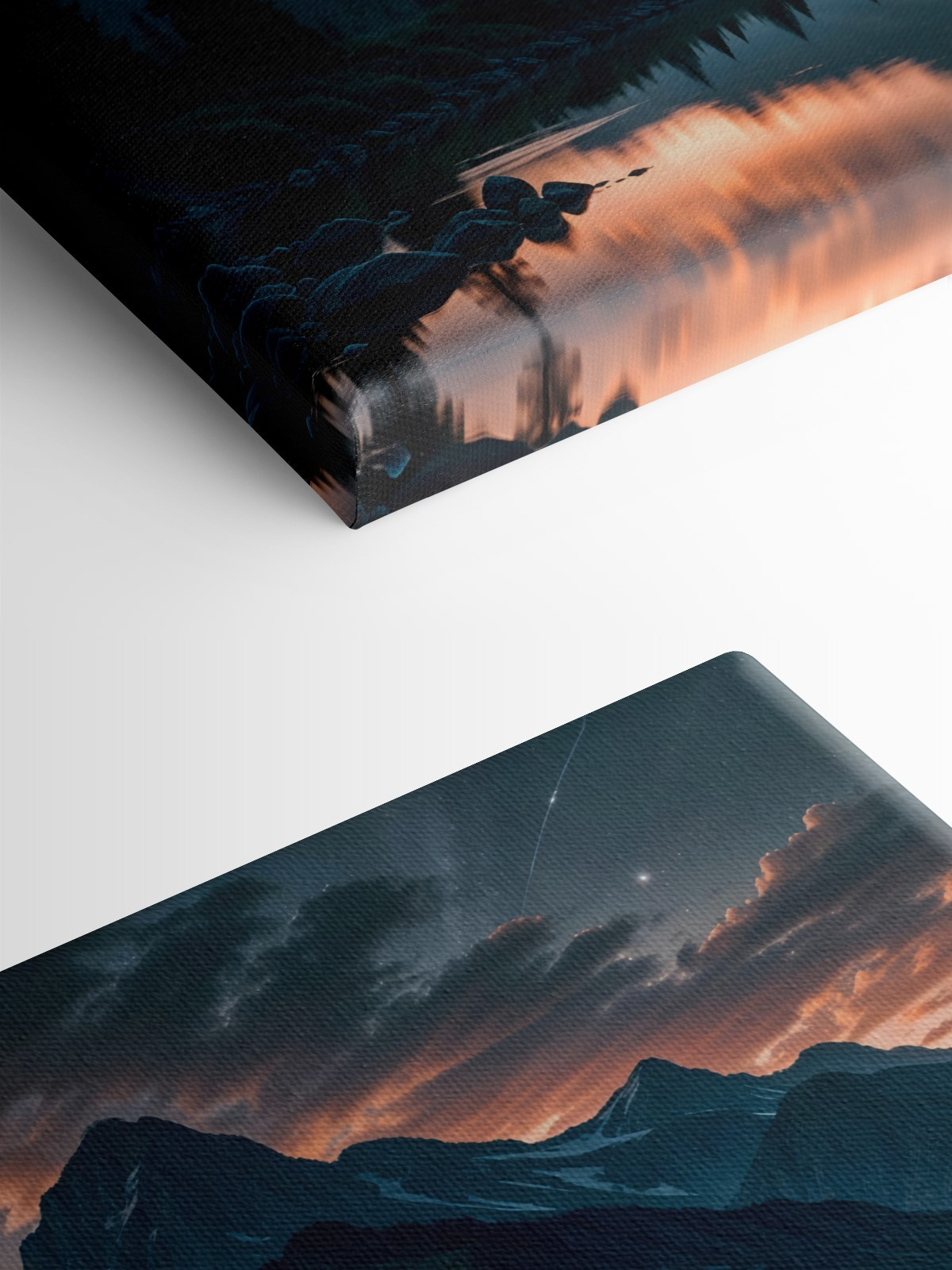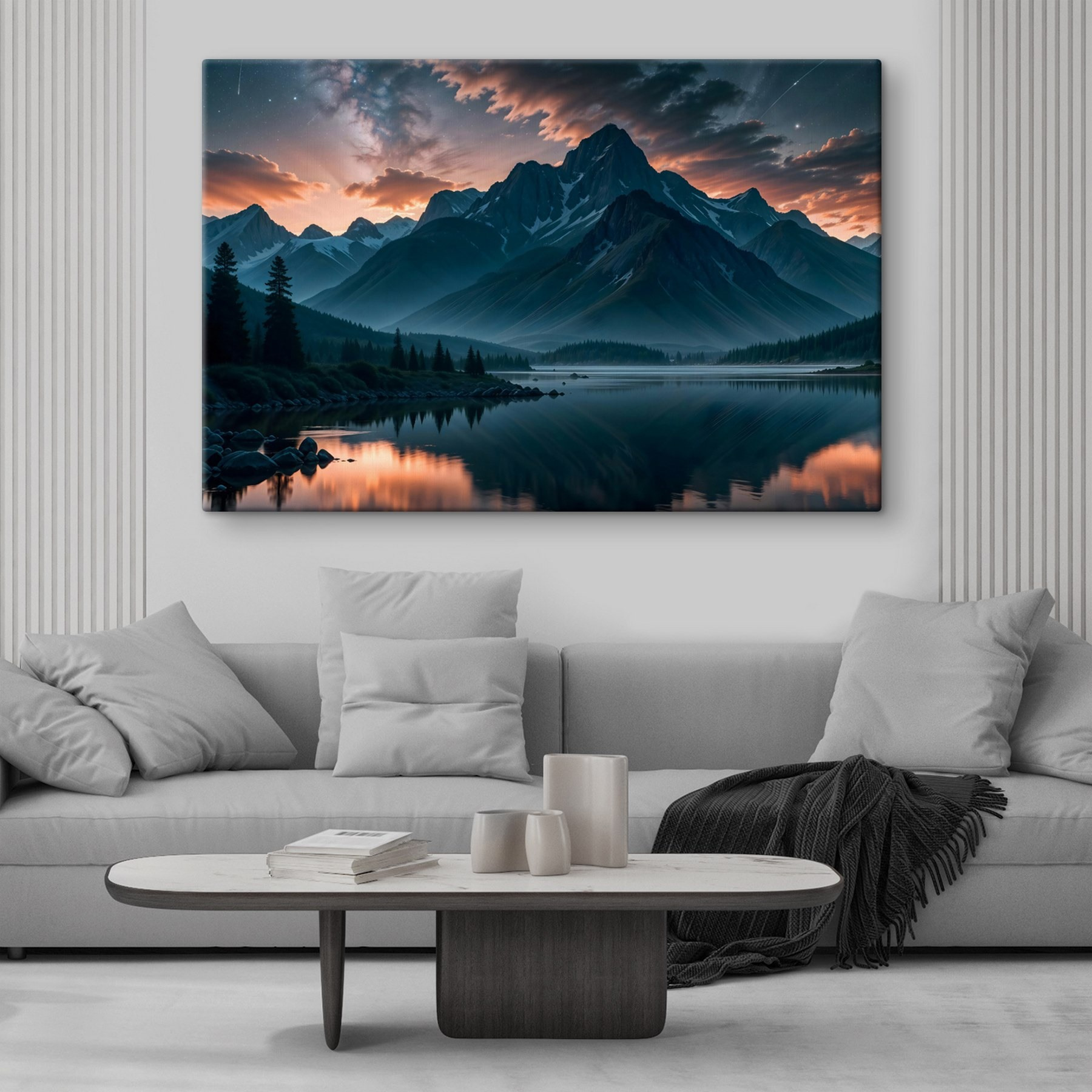 Stel je voor: een vredig meer dat majestueuze bergen weerspiegelt, gekust door de zachte gloed van de zonsondergang. Deze canvasprint is niet zomaar kunst; het is een moment bevroren in de tijd, klaar om iedereen die ernaar kijkt mee te nemen naar het buitenleven. Stel je voor dat je koffie drinkt terwijl je jezelf verliest in die diepe blauwe en warme tinten. Het is alsof je een stukje natuur in huis hebt, zonder de insecten en het weer. Bovendien lokt het gesprekken uit! Gasten zullen zich verbazen over de schoonheid, perfect voor die ‘wow’-factor in je woonkamer. Een dagelijkse herinnering dat avontuur slechts een oogopslag verwijderd is.