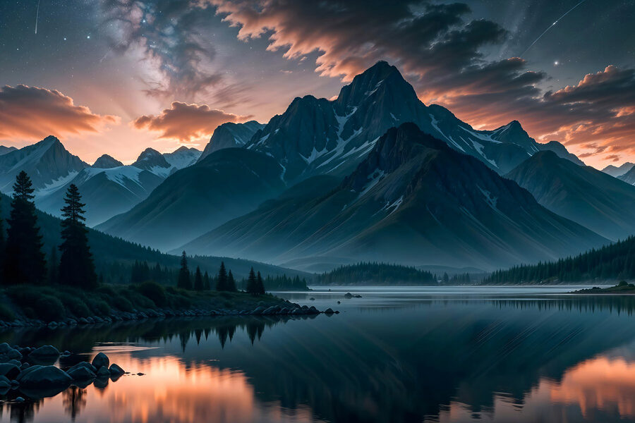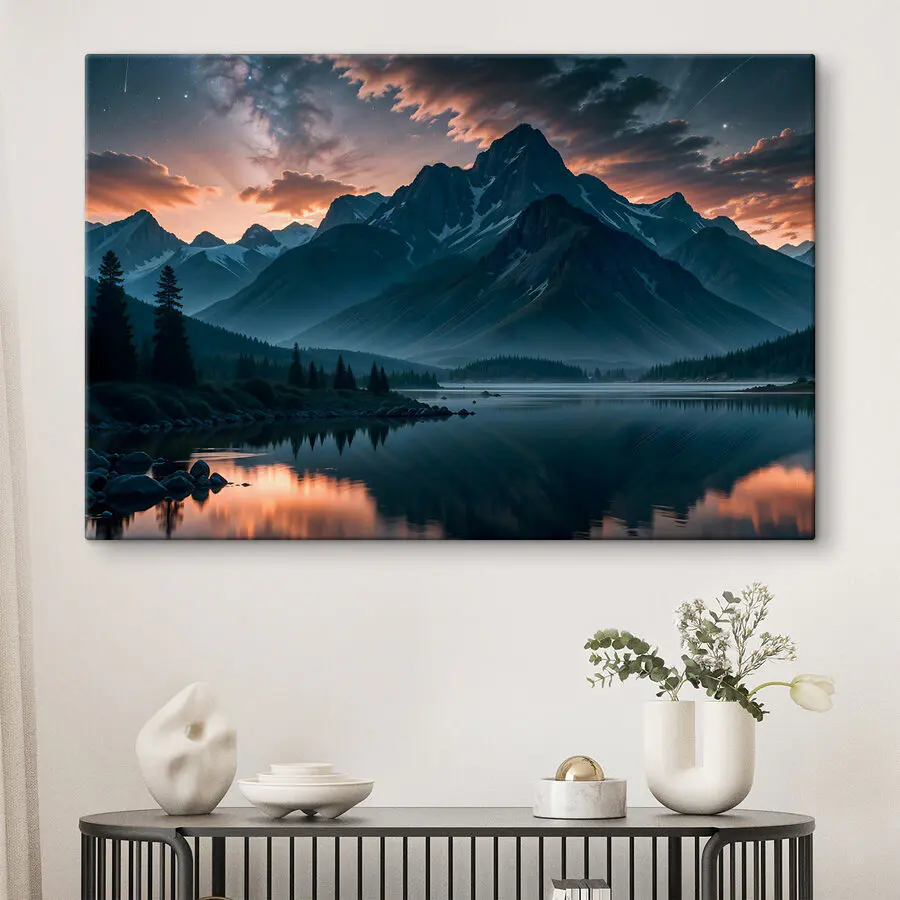 Stel je voor: een vredig meer dat majestueuze bergen weerspiegelt, gekust door de zachte gloed van de zonsondergang. Deze canvasprint is niet zomaar kunst; het is een moment bevroren in de tijd, klaar om iedereen die ernaar kijkt mee te nemen naar het buitenleven. Stel je voor dat je koffie drinkt terwijl je jezelf verliest in die diepe blauwe en warme tinten. Het is alsof je een stukje natuur in huis hebt, zonder de insecten en het weer. Bovendien lokt het gesprekken uit! Gasten zullen zich verbazen over de schoonheid, perfect voor die ‘wow’-factor in je woonkamer. Een dagelijkse herinnering dat avontuur slechts een oogopslag verwijderd is.