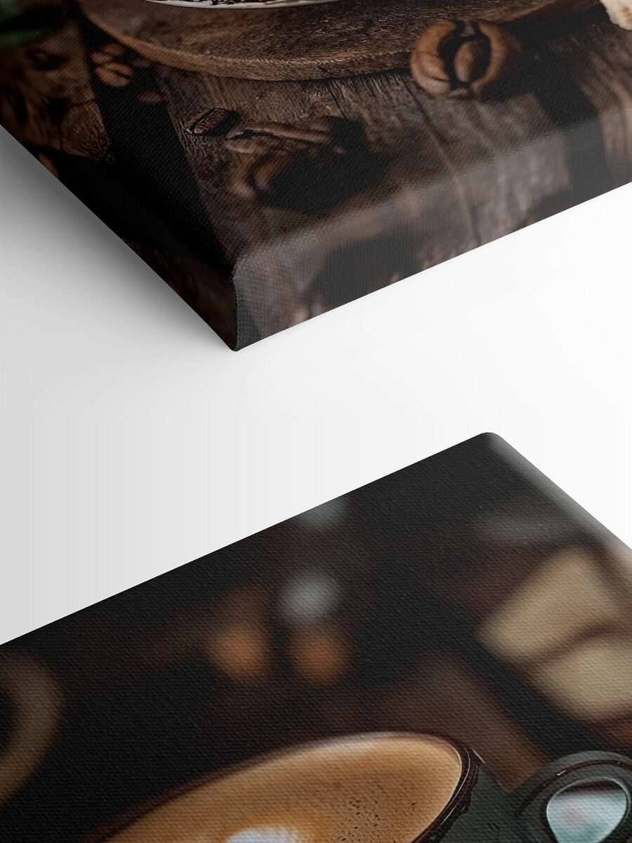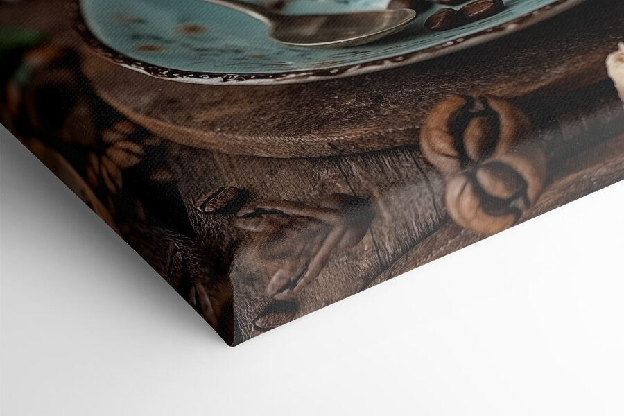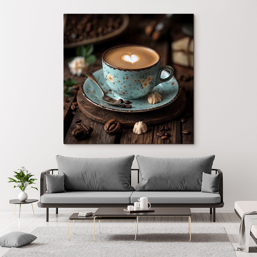 Transformeer elke ruimte met deze charmante canvasprint met een heerlijk kopje koffie bekroond met hartvormig schuim. Stel je voor dat je je keuken of gezellige hoekje binnenloopt en meteen de warme sfeer van een café voelt. De rustgevende kleuren en bloemenpatronen roepen een gevoel van kalmte op en nodigen bijna uit om te gaan zitten, langzaam te nippen en van het moment te genieten.
