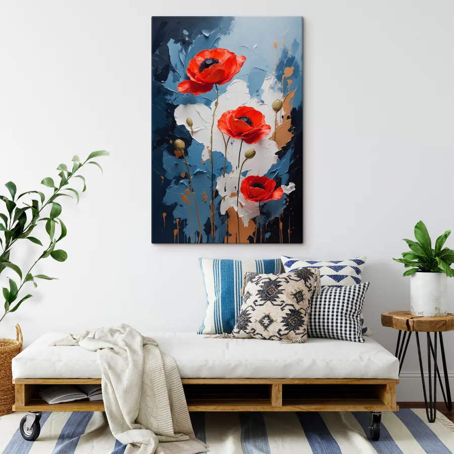 Fleur elke kamer op met deze prachtige canvasprint van levendige bloemen die dansen tegen een koele blauwe en witte achtergrond. Het is alsof je een vleugje natuur aan je muur hebt hangen! Stel je dit stuk voor als een conversatiestarter – gasten kunnen niet anders dan die gedurfde rode en delicate witte kleuren bewonderen. Of het nu een gezellige woonkamer is of een rustige studeerkamer, het brengt een beetje charme en vreugde. Stel je voor dat je aan je koffie nipt, een blik werpt en verdwaalt in de bloemblaadjes. Perfect voor bloemenliefhebbers of iedereen die een beetje pit aan zijn ruimte wil toevoegen. Een echte sfeermaker!