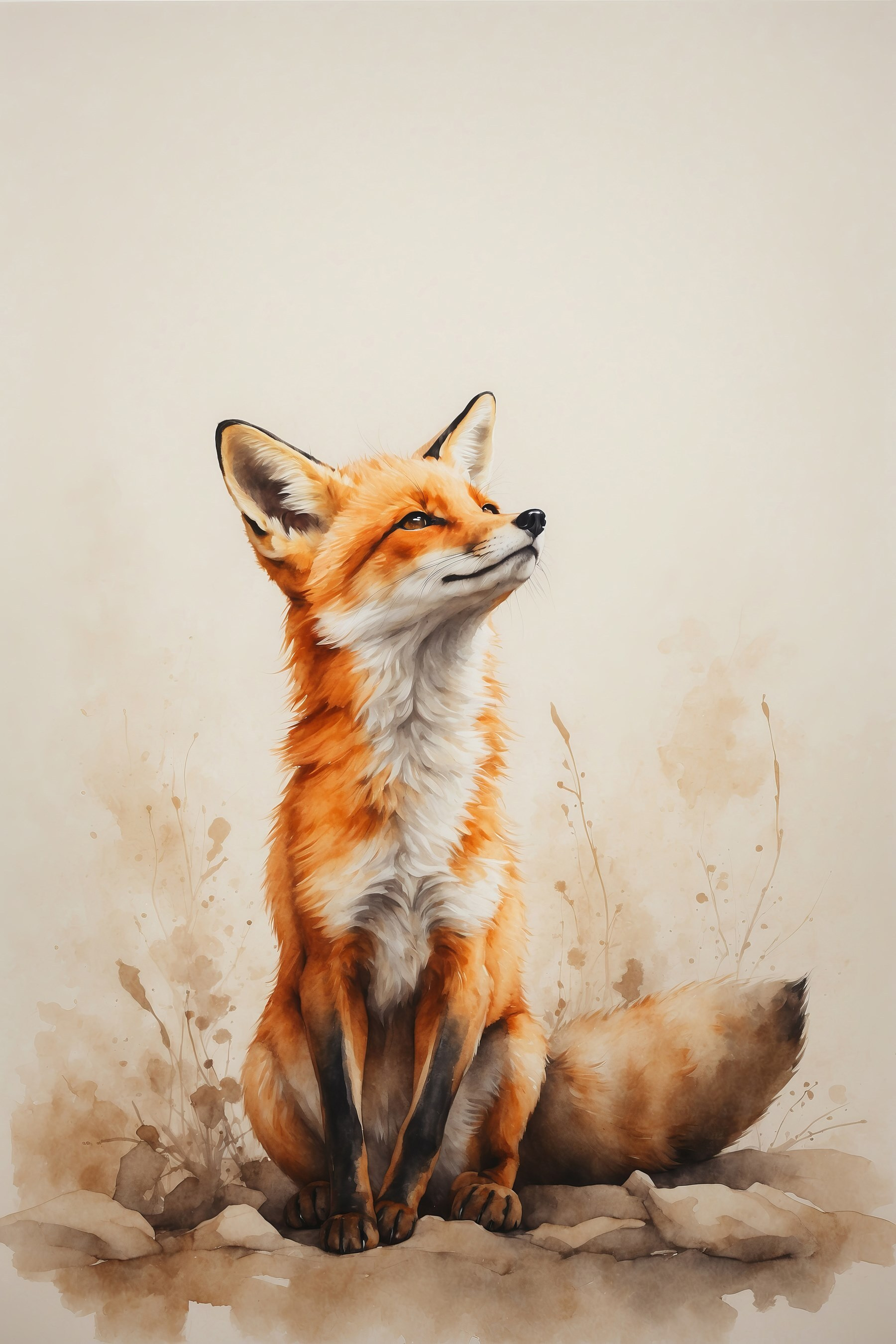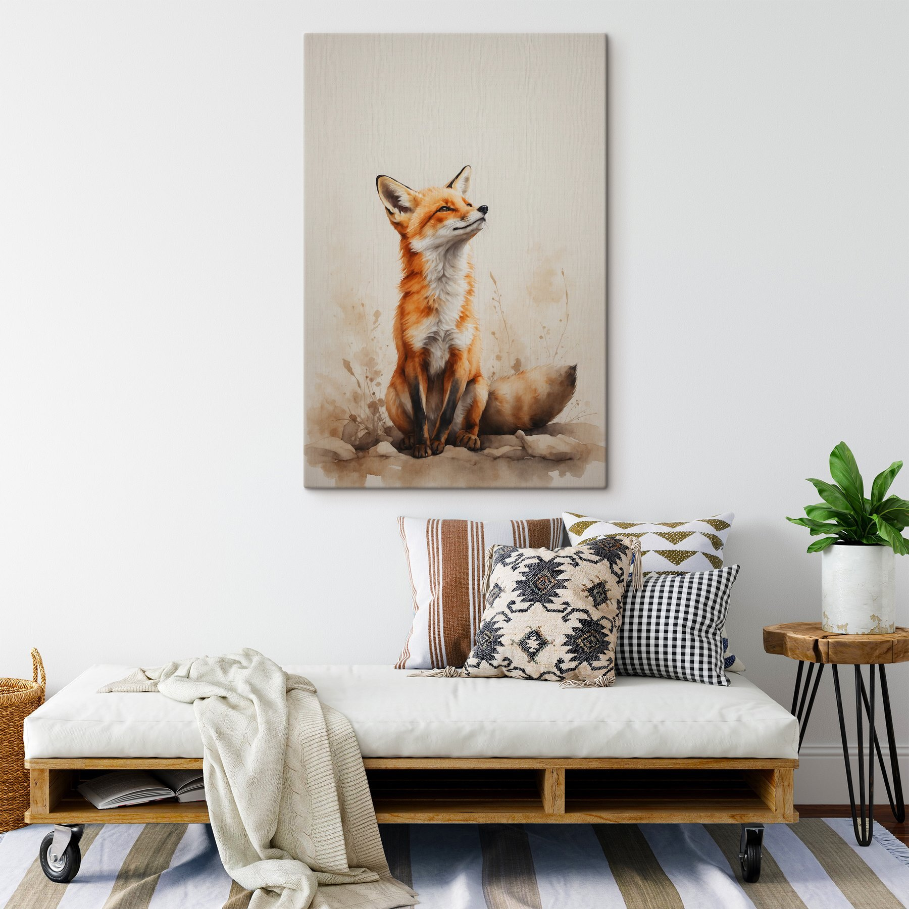 Geef je muren een vleugje charme met deze prachtige canvasprint van een vos, die met een speelse maar wijze uitdrukking naar de wereld kijkt. Het is alsof je een stukje natuur in je woonkamer hebt. Stel je voor hoe deze print een saai hoekje kan transformeren – opeens barst het van het leven en de persoonlijkheid. De warme sinaasappels en zachte aquarellen nodigen uit tot een knusse sfeer, perfect om in weg te kruipen met een goed boek of te kletsen met vrienden. Het is niet alleen decor; het is een kleine gespreksstarter. Voeg een vleugje eigenzinnigheid toe aan je huis, want wie wil er nu geen stijlvolle vos die de wacht houdt?