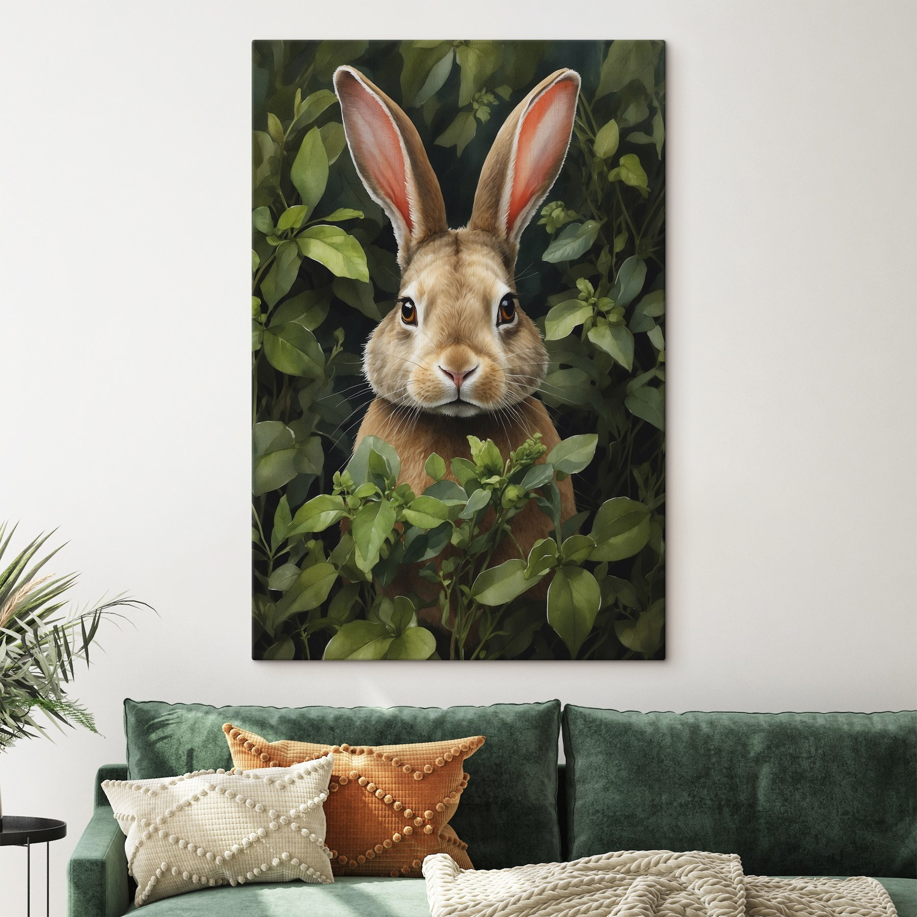 Breng een vleugje van de natuur in je huis met “Canvas Schilderijen Konijn in de struiken”. Dit charmante stuk toont een nieuwsgierig konijn dat door het weelderige groen gluurt. Het voegt meteen warmte en een vleugje speelse nieuwsgierigheid toe aan elke kamer. Stel je voor dat je je ontspant in je woonkamer en je wordt gezelschap gehouden door deze kleine man – het is alsof je een pluizige vriend hebt die nooit om eten of een wandeling vraagt.