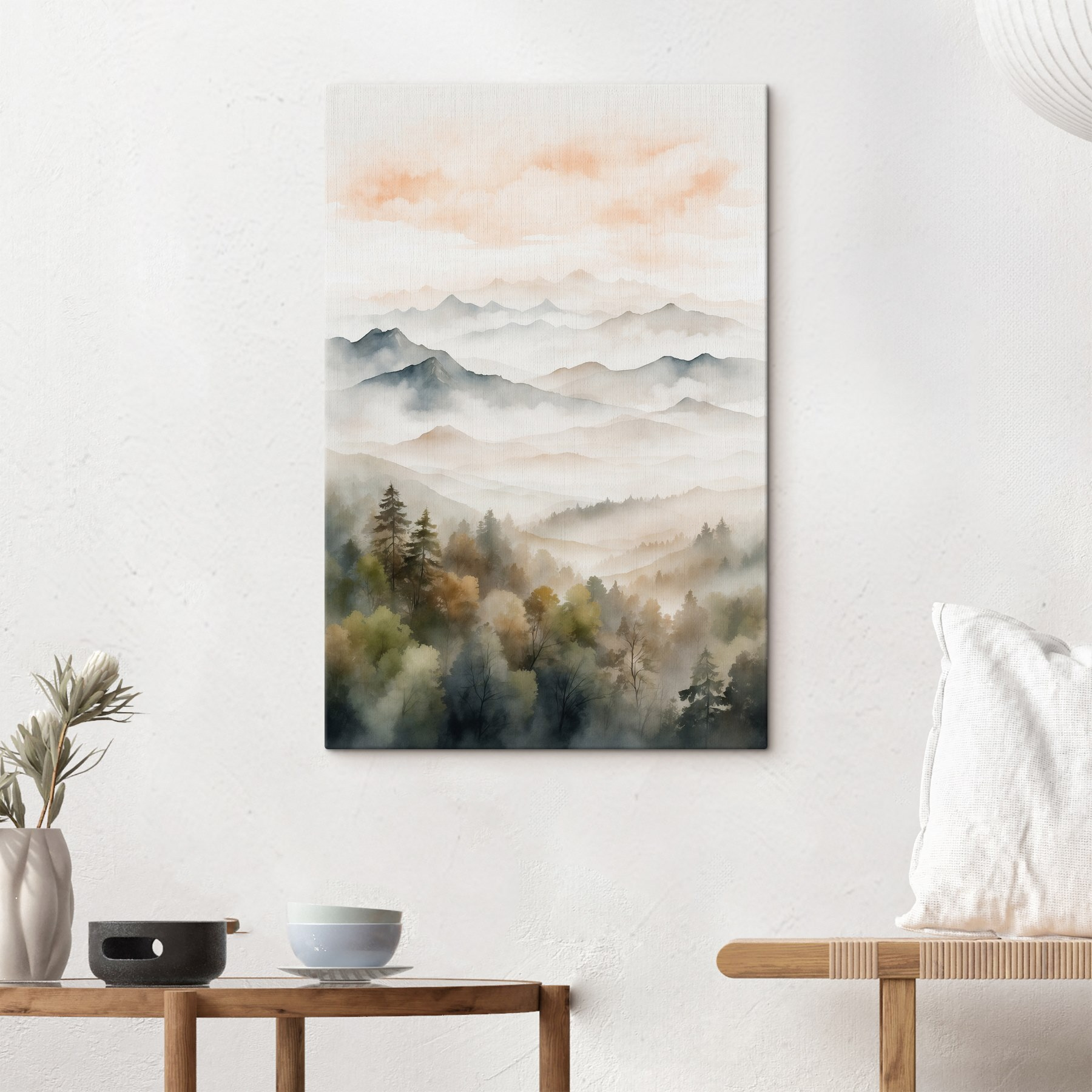 Transformeer je kamer met deze prachtige aquarel canvasprint met bergen en bomen in een dromerige waas. Stel je voor dat je ‘s ochtends aan je koffie nipt, gewikkeld in een deken, terwijl zachte groene en oranje tinten over je muren spoelen en je zachtjes doen denken aan vredige wandelingen in het bos. Het heeft die serene sfeer waardoor je je meteen op je gemak voelt, alsof je elke dag even weg bent. Perfect voor een gezellige woonkamer of een rustige slaapkamer, dit stuk nodigt de natuur uit om binnen te komen. Wie wil er nu geen stukje magie van het bos om zijn dag op te fleuren?