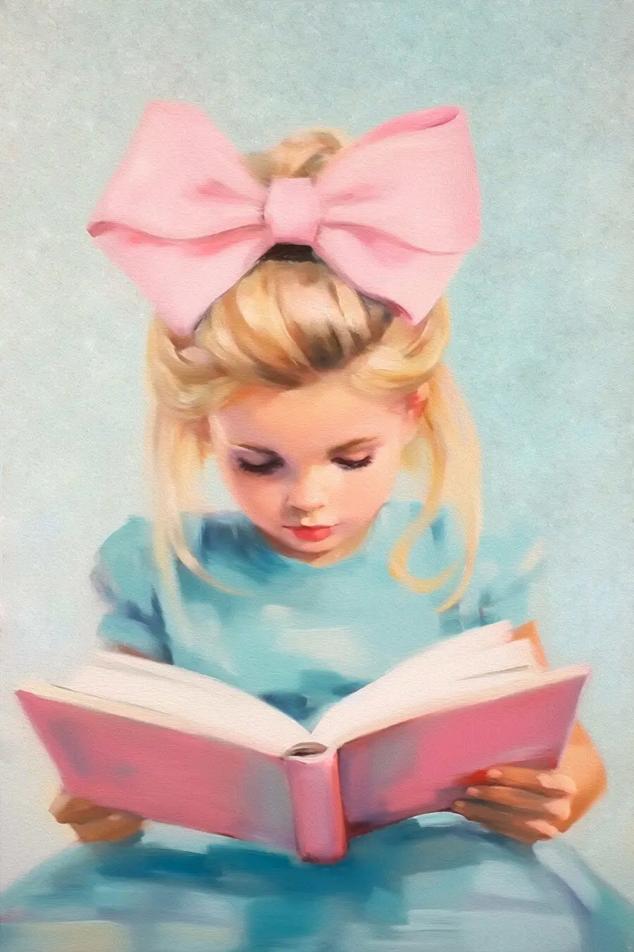 Transformeer elke ruimte met deze charmante canvasprint met een lief meisje verdwaald in haar boek, compleet met een prachtige roze strik die geheimen van kinderlijke verwondering lijkt te fluisteren. Stel je voor dat dit vrolijke stuk een speelkamer of een gezellige leeshoek siert – stel je voor dat de kleintjes zich verzamelen, geïnspireerd om in hun eigen avonturen te duiken. De zachte tinten zijn als een zachte knuffel voor de ogen, waardoor het perfect is om de verbeelding aan te wakkeren. Het is niet zomaar een decor; het is een stuk dat uitnodigt tot verhalen en dagdromen, waardoor elke blik een ervaring wordt die het waard is om van te genieten. Echt, wie zou er niet samen met haar in dat boek willen stappen?