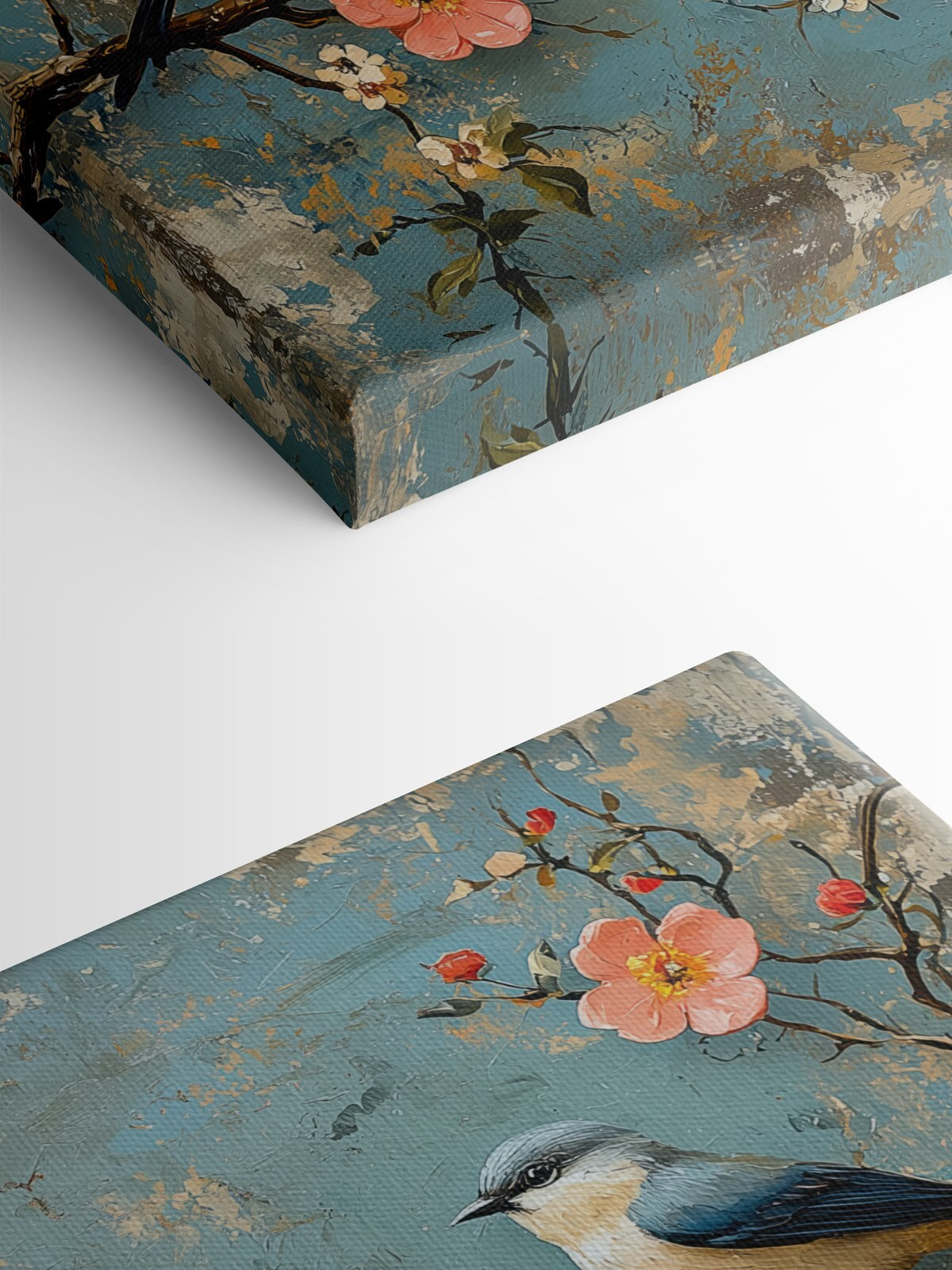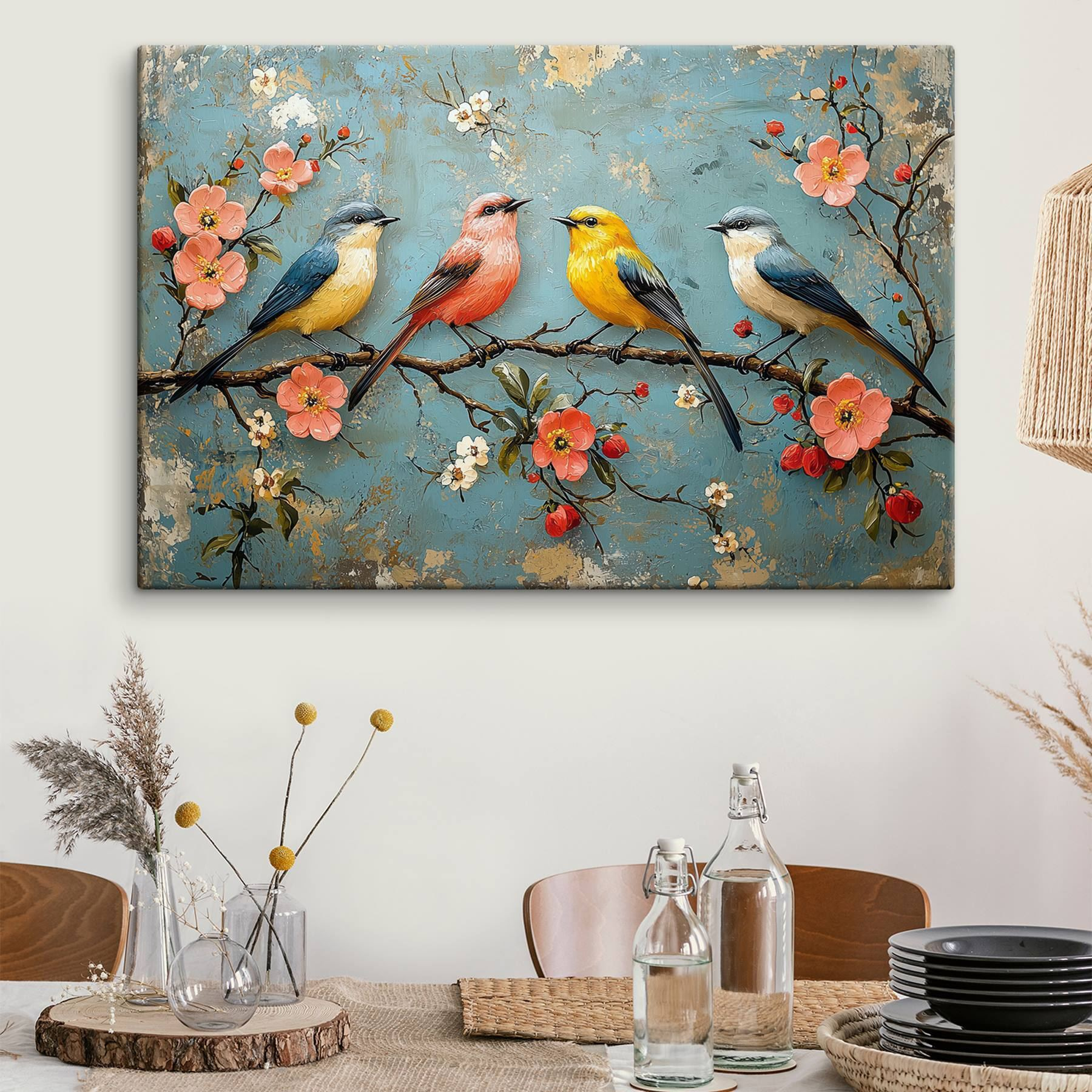Stel je een gezellig hoekje in je huis voor, waar een heerlijk vleugje kleur het buitenleven naar binnen brengt. Deze canvasprint, met een vrolijke groep vogels op een tak met bloeiende bloemen, doet precies dat. Het is als een charmant praatje tussen gevederde vrienden, elk met zijn eigen persoonlijkheid. De zachte tinten en rijke texturen creëren een warme sfeer die uitnodigt tot glimlachen en dagdromen. Of het nu in een woonkamer of een zonnig hoekje hangt, het zal zeker opvallen en gesprekken op gang brengen. Perfect om een extra vleugje natuur aan te brengen. Je zult elke keer glimlachen als je langsloopt – het is alsof je het hele jaar door een stukje lente hebt!