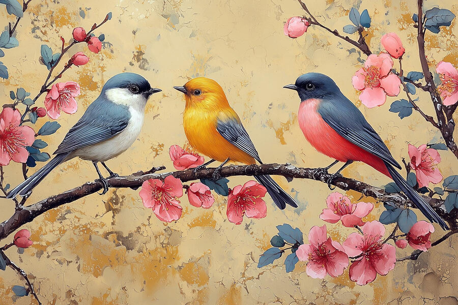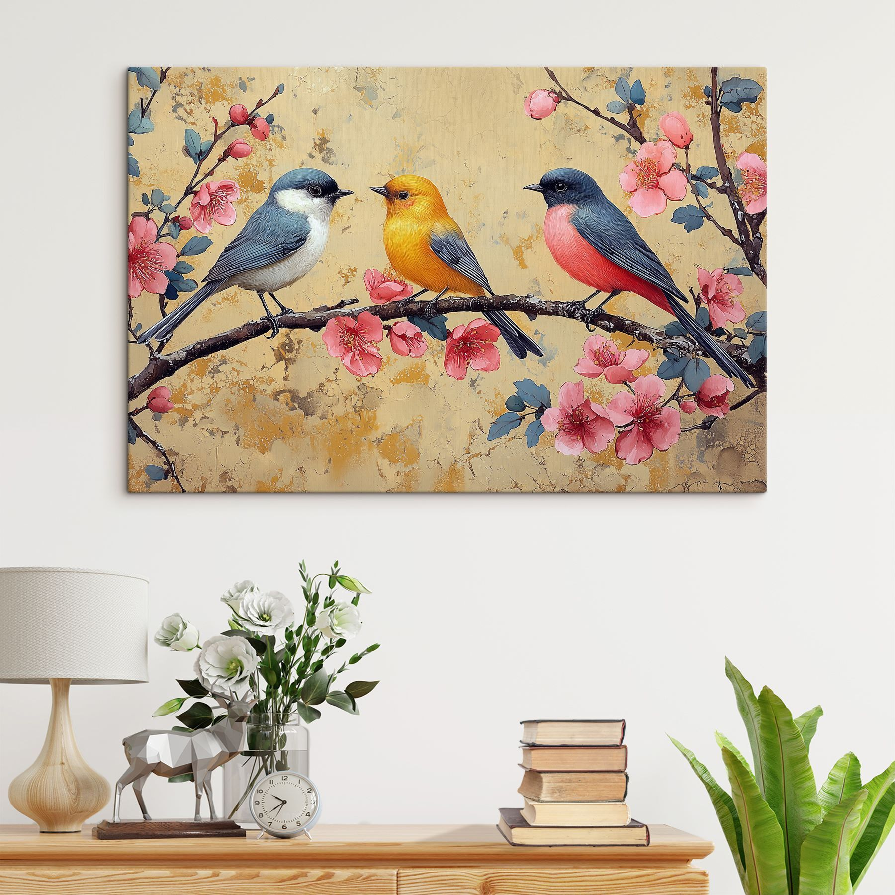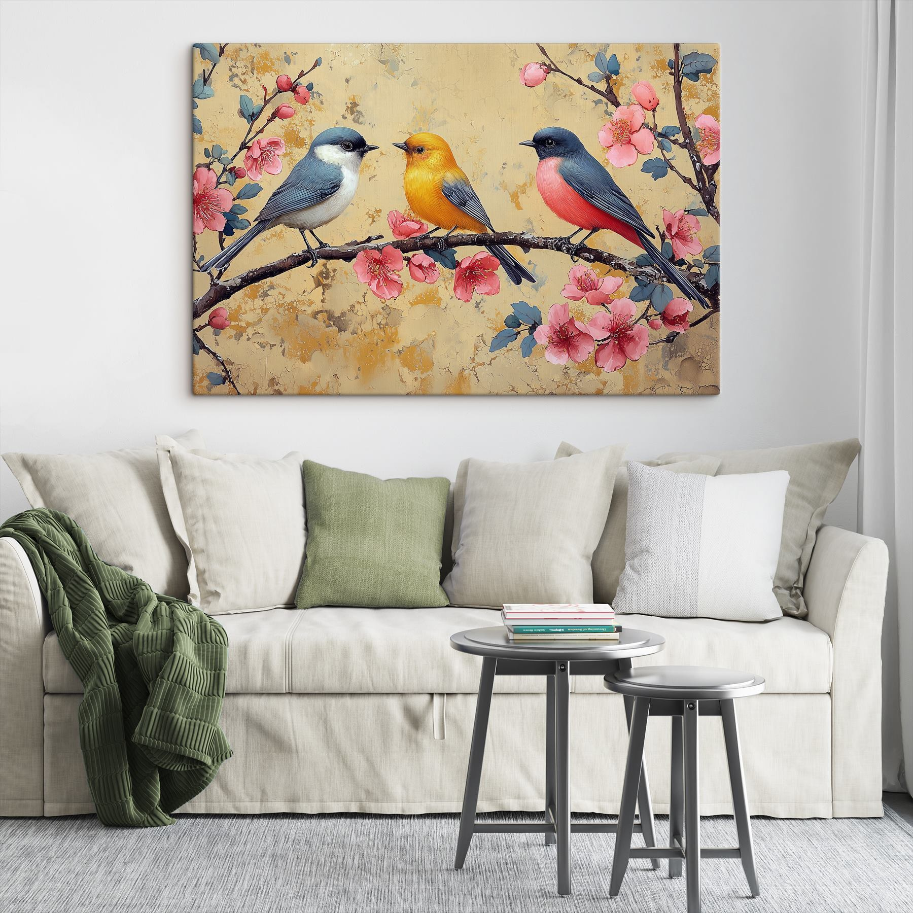 Fleur elke ruimte op met deze charmante canvasprint met een verrukkelijk trio vogels op een tak versierd met prachtige bloemen. Elke gevederde vriend brengt zijn eigen vleugje kleur en voegt een vleugje natuurlijke eigenaardigheid toe aan je muren. Stel je voor dat dit levendige stuk in een gezellig hoekje hangt, waar het de aandacht steelt en een glimlach ontlokt telkens als er iemand voorbij loopt. Het is net alsof je een stukje van het buitenleven in huis hebt – perfect voor natuurliefhebbers of iedereen die zijn of haar inrichting wat wil opvrolijken. Hang hem op, leun achterover en laat de vrolijke sfeer je overnemen!