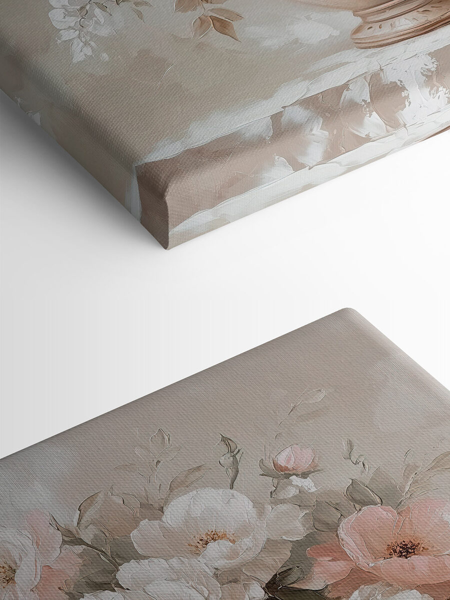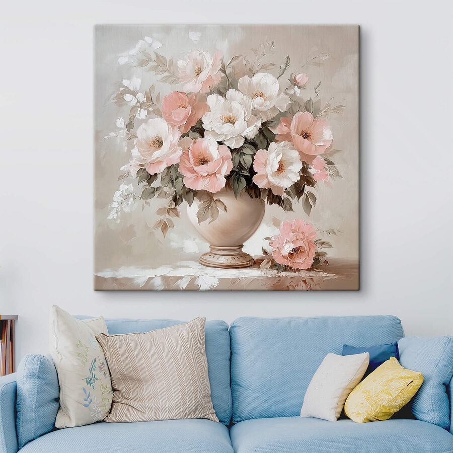 Fleur elke kamer op met deze prachtige canvasprint van bloemen in een vaas. Het is alsof je een hele tuin in huis haalt zonder dat je water hoeft te geven – geen groene vingers nodig! Met zacht roze en wit voelen deze bloemen als een zachte knuffel voor je muren. Stel je gezellige ochtenden voor, nippend aan een kopje koffie en dit kunstwerk dat het licht precies vangt, waardoor alles net iets specialer aanvoelt. Het is perfect om een vleugje charme van de natuur toe te voegen aan je interieur. En wie houdt er niet van een beetje bloemenflair? Een echte gespreksstarter!