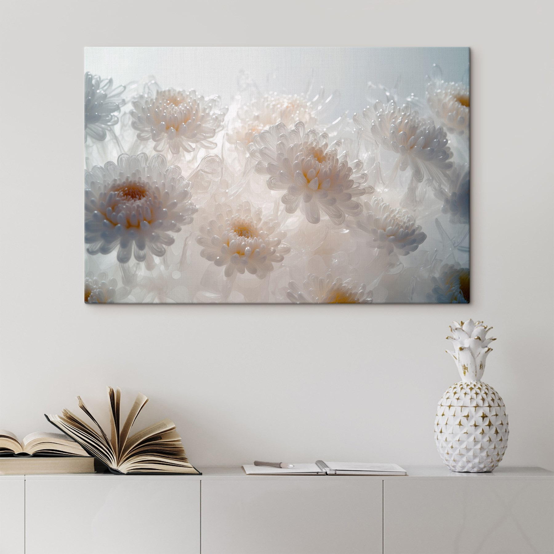 Fleur elke kamer op met deze prachtige canvasprint met een charmante groep witte bloemen. Stel je voor dat je je woonkamer binnenloopt en daar hangt een zachte uitbarsting van natuurlijke schoonheid aan je muur. Deze bloemen lijken te fluisteren, “Haal adem, alles is goed!”. Perfect voor een knusse leeshoek of een serene slaapkamer, ze nodigen uit tot een gevoel van vrede dat gewoon goed voelt. Bovendien hoeven ze geen water te krijgen, wat altijd mooi meegenomen is! Het is net alsof je je eigen tuin hebt, zonder de vervelende bijen. Kleed je muren aan en laat deze bloemen een glimlach op je gezicht toveren!