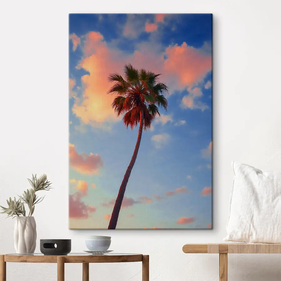 Deze canvasprint met een palmboom tegen een helderblauwe lucht is als een stukje paradijs bij je thuis. Stel je voor dat je lekker op de bank ligt, de warme gloed van de zonsondergang door je raam naar binnen schijnt en dit kunstwerk je een heerlijk vakantiegevoel geeft. Het zachte wiegen van de boom en die pluizige wolken creëren een serene ontsnapping, perfect om te dagdromen of gewoon tot rust te komen. Het is niet alleen decor; het is een sfeermaker! Hang het op en zie hoe je ruimte verandert in een tropisch uitje. Wie wil er nu geen dagelijkse herinnering aan zonnige luchten en een zacht briesje? Het is net een mini-vakantie elke keer dat je er naar kijkt!