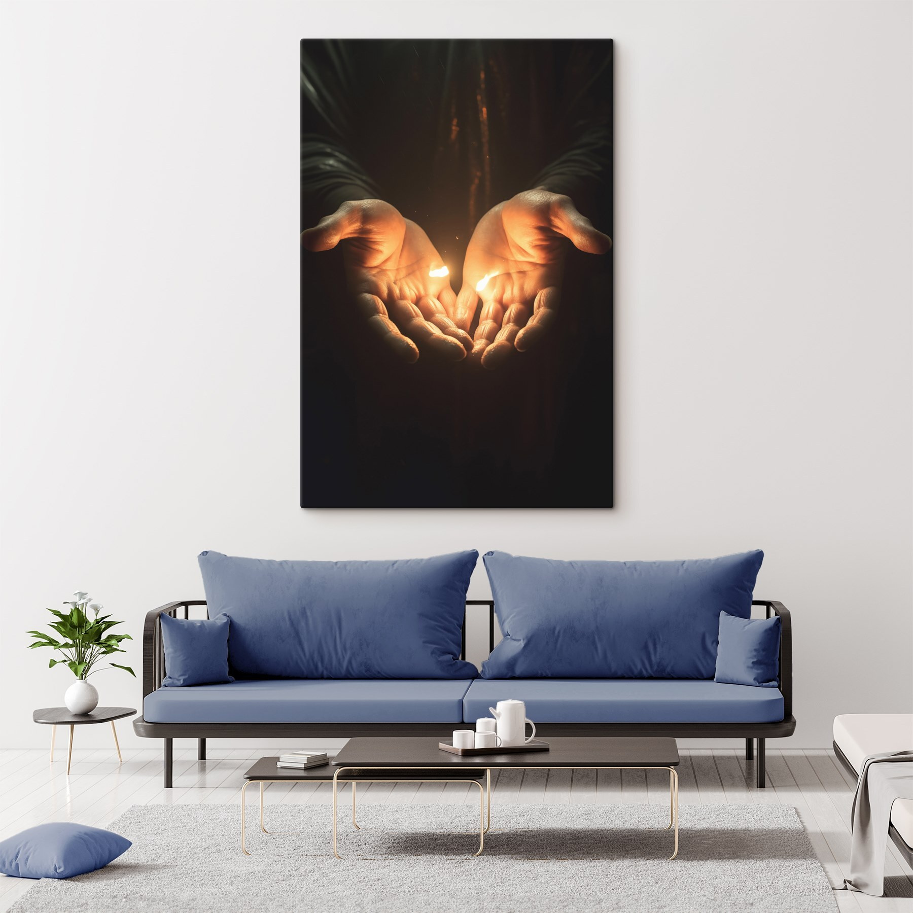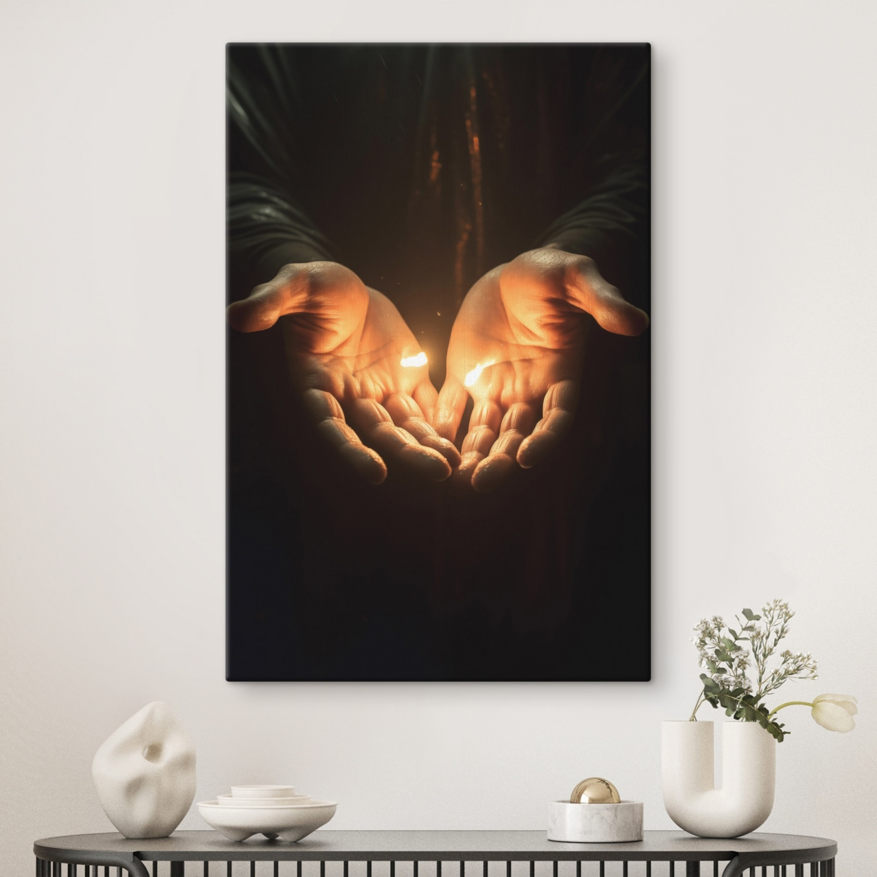Stap in een wereld waar handen de flikkering van het licht wiegen en een gezellige, bijna magische sfeer creëren. Deze canvasprint is niet zomaar een kunstwerk; het is een uitnodiging om even stil te staan en na te denken, om de warmte in te ademen. Stel je voor dat dit in een schemerige kamer hangt, zachte schaduwen werpt en gesprekken over verbinding en zorg stimuleert. Het is perfect voor iedereen die houdt van een vleugje inspiratie in hun ruimte. Misschien roept het herinneringen op aan sterren kijken op een heldere nacht of de simpele vreugde van het delen van een warm kopje met een vriend. Een uniek stuk dat je huis omhult in een zachte omhelzing, waardoor elk moment een beetje helderder wordt.