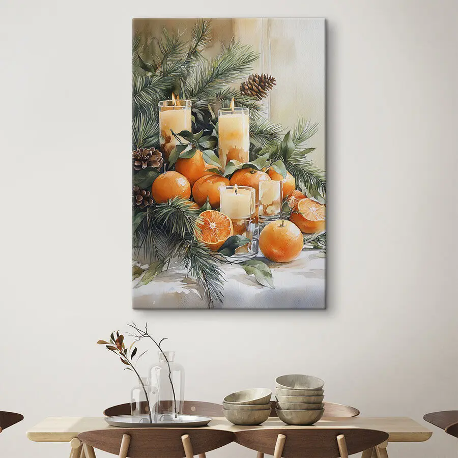 Breng een vleugje warmte in elke ruimte met deze prachtige canvasprint met levendige sinaasappels en zachte, gloeiende kaarsen. Stel je voor: je loopt een kamer binnen en het uitnodigende tafereel fleurt je dag meteen op. Die sappige sinaasappels knallen van kleur, terwijl het flikkerende kaarslicht een gezellige sfeer toevoegt – perfect om thee te drinken op een regenachtige middag of vrienden te ontvangen.