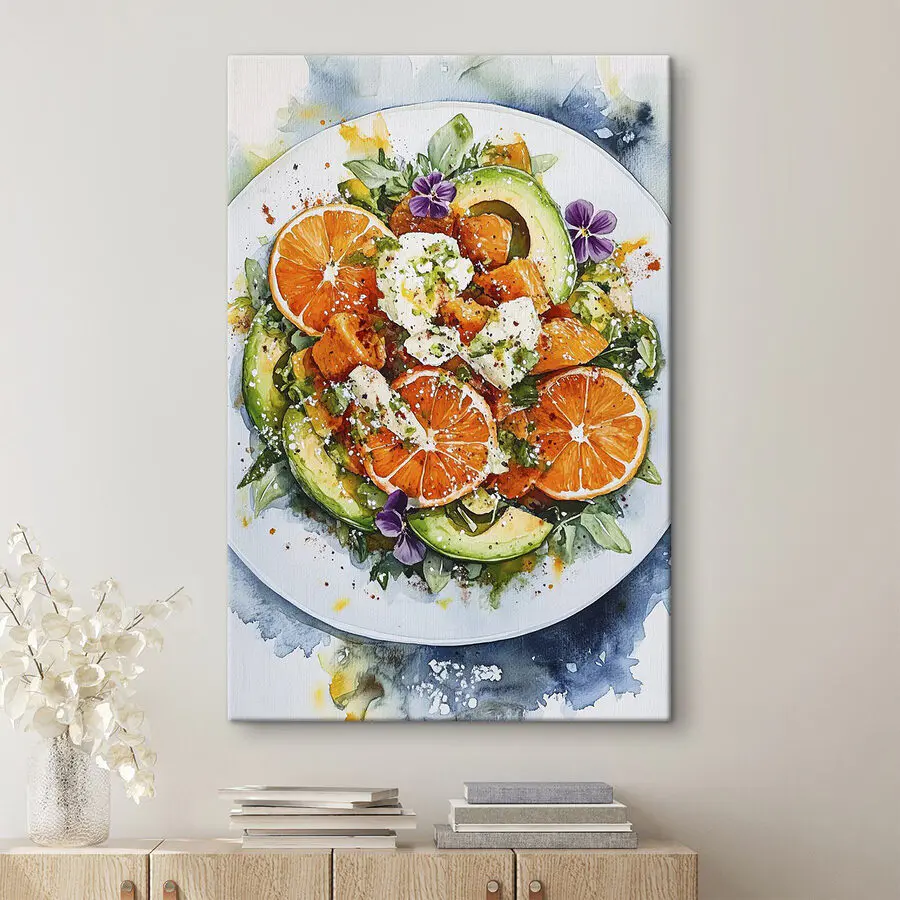 Fleur elke ruimte op met deze charmante canvasprint met een heerlijk bord eten dat liefdevol is bedekt met levendige sinaasappels en romige avocado. Het is niet alleen een vleugje kleur; het is een lust voor het oog! Stel je voor dat je langsloopt en een glimp opvangt van die sappige plakjes – instant geluk. Perfect voor een keuken of eethoek, het zal gesprekken op gang brengen en misschien zelfs trek opwekken. Wie wil er nou niet dat zijn gasten een kunstwerk bewonderen terwijl ze stiekem aan hun volgende maaltijd denken? Door de subtiele details voelt het levendig aan, alsof je de citrusvruchten bijna kunt ruiken.
