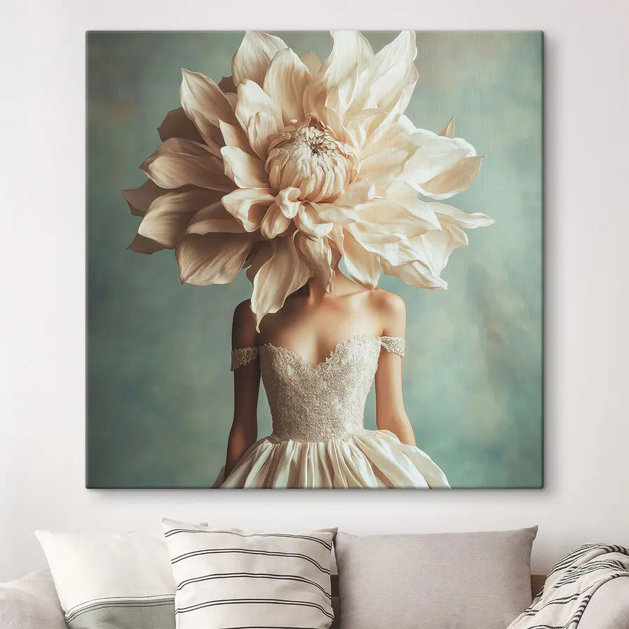 Stel je voor dat je een kamer binnenloopt en je oog valt op een prachtig doek. Het is als een frisse wind met een twist! Dit kunstwerk, met een sierlijke figuur in een dromerige jurk en een bloem die barst van leven in plaats van een hoofd, wekt nieuwsgierigheid op. Het voegt een vleugje eigenzinnigheid toe alsof het net uit een sprookje komt.
