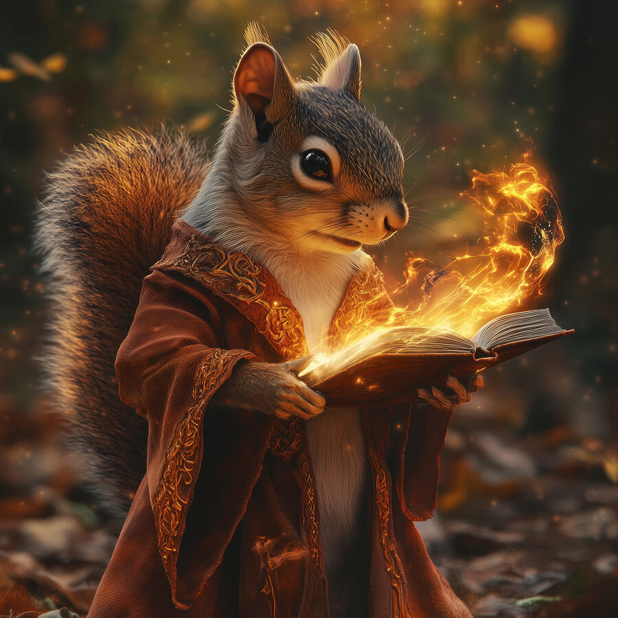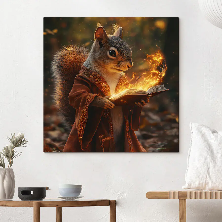 Duik in de betoverende wereld van deze grillige canvasprint met een eekhoorn die, gehuld als een kleine tovenaar, een boek vasthoudt dat letterlijk barst van de vlammen. Het is het perfecte vleugje magie voor elke kamer. Stel je voor dat je je kamer binnenloopt en begroet wordt door een kleine geleerde die de geheimen van het bos met je wil delen – over een conversatiestarter gesproken! De levendige kleuren dansen met warmte en zorgen voor vreugde en misschien wel een lach of twee. Perfect voor dierenliefhebbers of iedereen die op zoek is naar een vleugje van het buitengewone in hun interieur. Telkens als je naar dit object kijkt, zal het je verhalen over avontuur influisteren. Wie wil er nou niet zo’n vurige kleine vriend die zijn dag opfleurt?