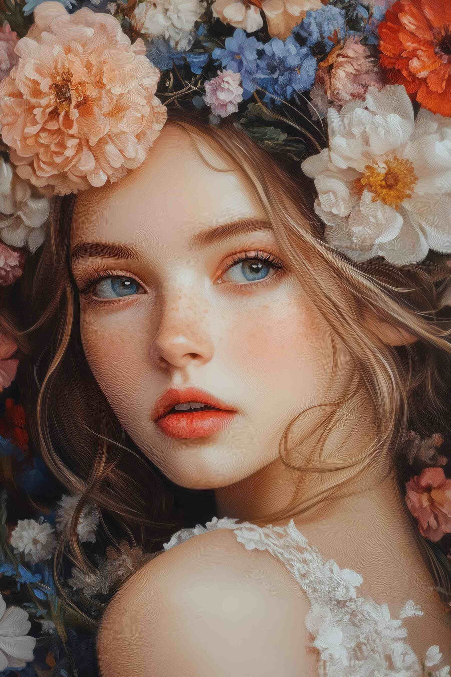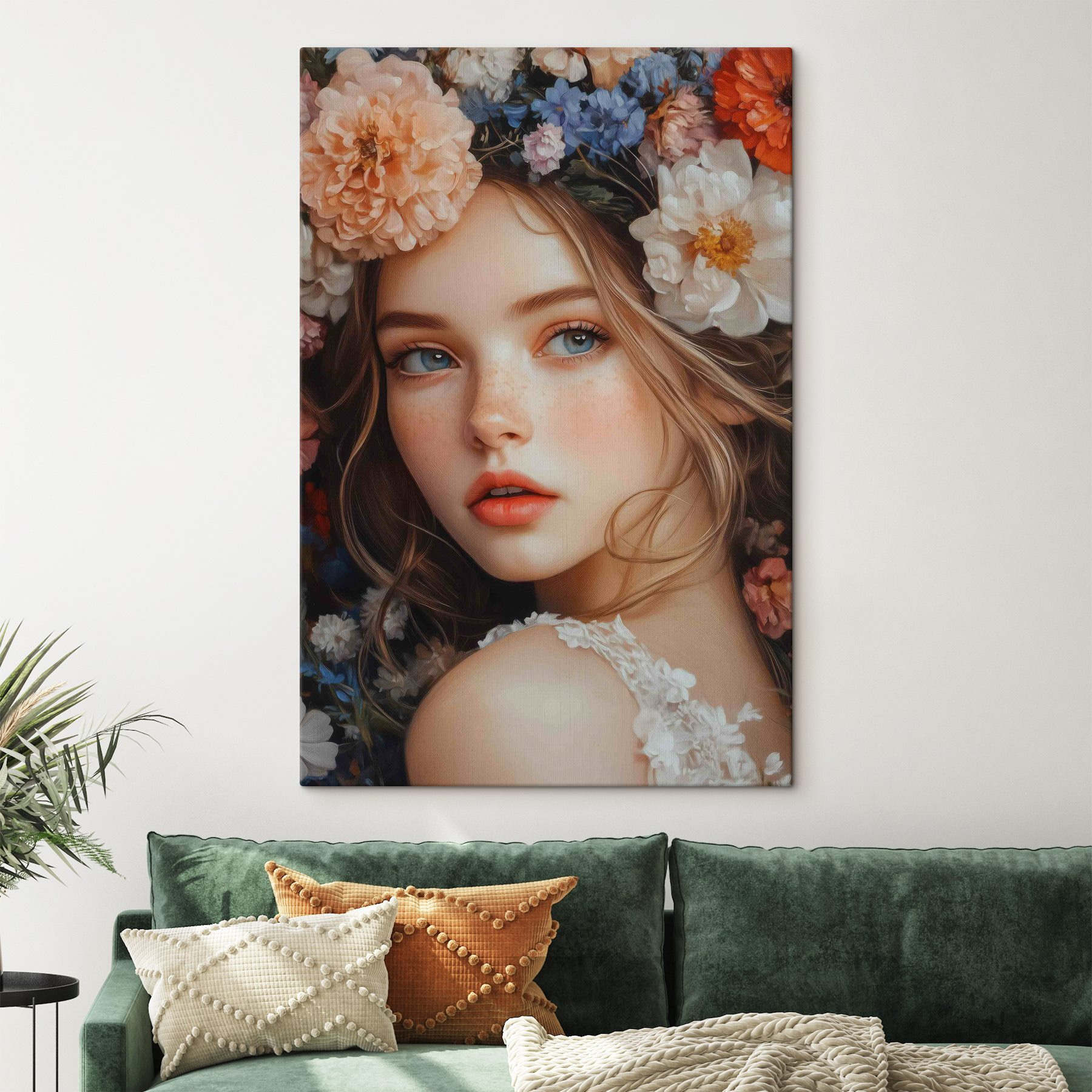 Stap in een levendige wereld met deze betoverende canvasprint. Het werk toont een vrouw getooid met een prachtige reeks bloemen, boordevol warmte en leven. Het is niet zomaar kunst; het voelt als een frisse wind in je interieur en nodigt je uit om te ontsnappen naar een droomtuin. Stel je voor dat je er dagelijks langs loopt – kun je die vreugdeboost voelen? De kleuren knallen, de expressie resoneert; het is bijna alsof ze je geheimen van de natuur influistert. Perfect voor wie houdt van een vleugje vrolijkheid en elegantie. Deze muurschildering heeft persoonlijkheid, klaar om gesprekken op gang te brengen en de toon te zetten in elke kamer. Een beetje magie van de natuur op je muur.
