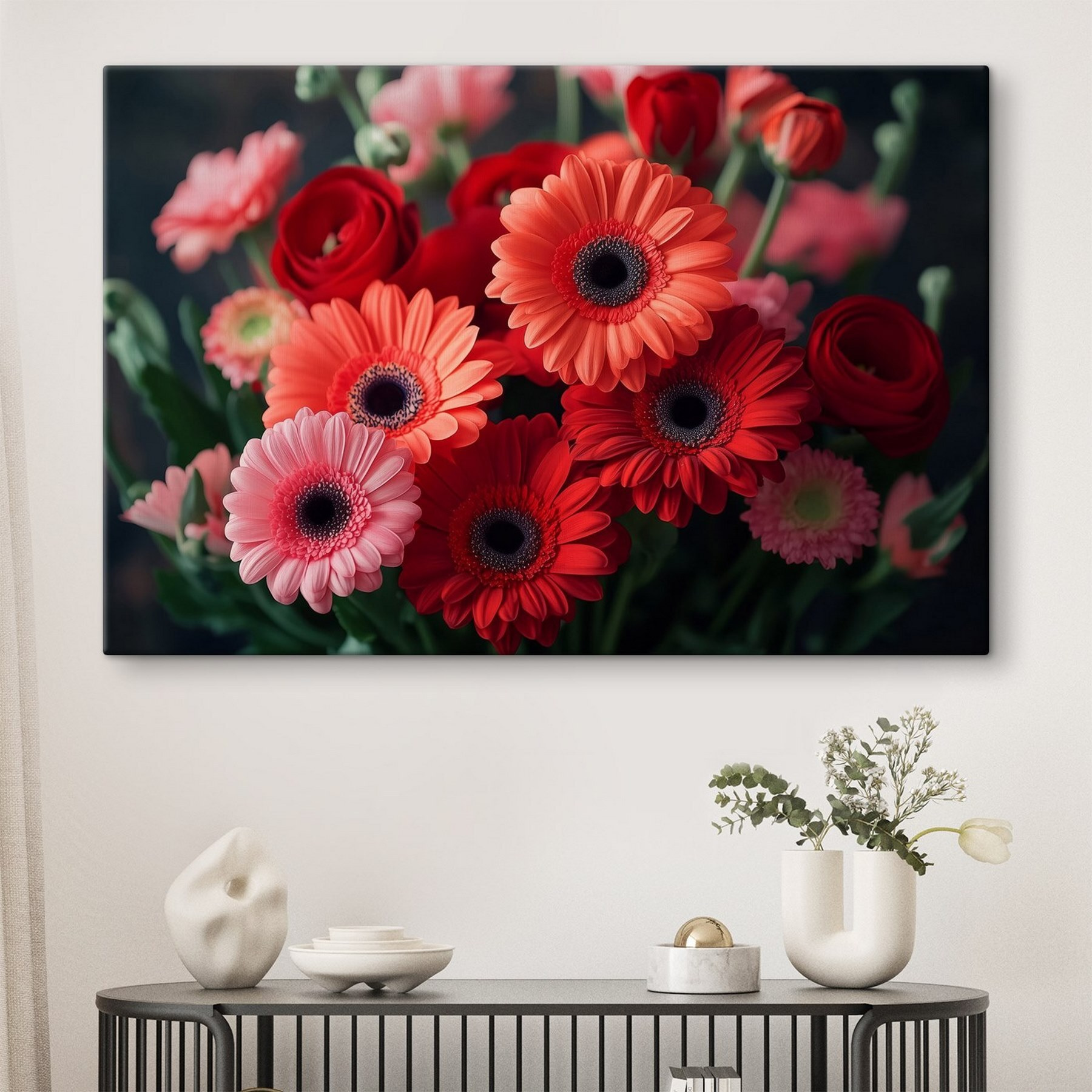 Breng een vrolijke sfeer in je interieur met de “Bouquet of Flowers” canvasprint. Met levendige rode en zachtroze tinten is het net een eeuwigdurende lentedag, maar dan zonder het niezen door pollen! Stel je voor dat je je kamer binnenloopt en je meteen opgevrolijkt voelt – deze speelse bloemen doen dat. Perfect voor een gezellig hoekje of een inspirerend kantoor, dit stuk nodigt uit tot glimlachen en misschien zelfs een grinnik of twee. Het fluistert verhalen van zonnige dagen en vreugde, waardoor elke blik een klein moment van geluk wordt. Wie wist dat bloemen zoveel warmte in huis konden brengen?