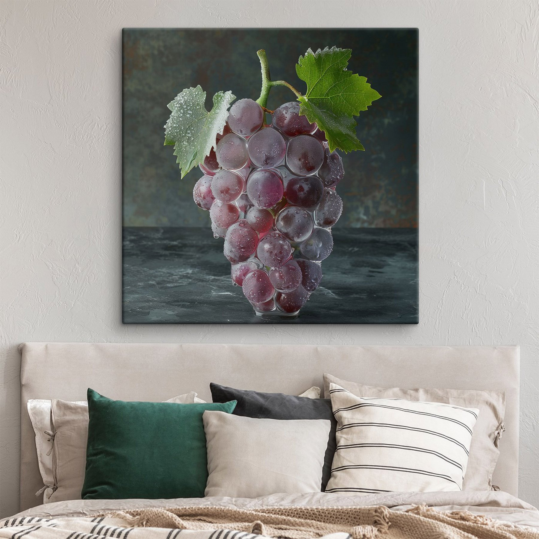 Stel je voor dat je een gezellige keuken binnenloopt en begroet wordt door een levendige tros druiven, glinsterend van de verse ochtenddauw. Deze canvasprint legt dat moment vast: sappig, mollig en o zo uitnodigend. Het is een lust voor het oog die iedereen doet verlangen naar een snack of op zijn minst een glas wijn. Perfect voor een eethoek of zelfs een thuisbar, het voegt een vleugje kleur en een vleugje eigenzinnigheid toe. Wie had gedacht dat een tros druiven gesprekken kon ontketenen over favoriete snacks of de beste wijncombinaties? Hang hem op en laat de gezelligheid maar komen! Het is een stukje vreugde aan je muur.