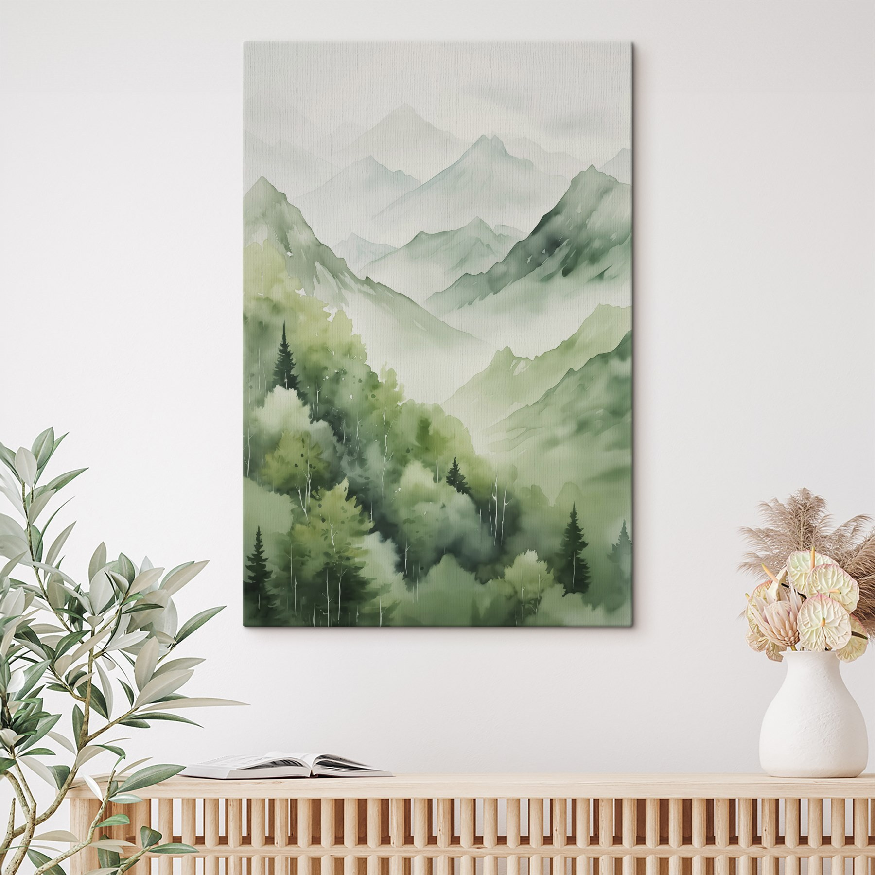 Tover je ruimte om in een gezellig toevluchtsoord met deze prachtige canvasprint van een bergketen. Stel je voor dat je elke dag wakker wordt met de zachte tinten groen en zachte lagen mist die je uitnodigen om de natuur te verkennen, zelfs als de enige top die je verovert die stapel wasgoed is. Elke penseelstreek vangt de serene schoonheid van de natuur, waardoor het een perfecte ontsnapping is aan de chaos van het dagelijks leven. Hang hem in je woon- of slaapkamer en voel je zorgen wegsmelten terwijl je verdwaalt in de rust van de bergen. Het is meer dan alleen decor; het is alsof er een frisse wind aan je muur hangt.