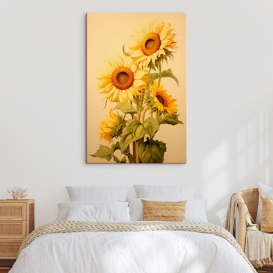 Fleur elke ruimte op met deze prachtige canvasprint van zonnebloemen tegen een zachte witte achtergrond. Over een sfeermaker gesproken! De levendige gelen en aardgroene tinten geven een vrolijke sfeer die je het gevoel geeft dat je in een zonnige tuin zit, zelfs als het buiten giet. Stel je voor dat je langs dit stuk loopt – het is als een kleine uitbarsting van vreugde, perfect voor die lege muur in de woonkamer of een gezellig hoekje waar je je oprolt met een boek. En wie kan de charme van zonnebloemen weerstaan? Het lijkt wel of ze naar je teruglachen. Voeg een vleugje natuur toe aan je inrichting en laat die zonnige vibes maar stromen!