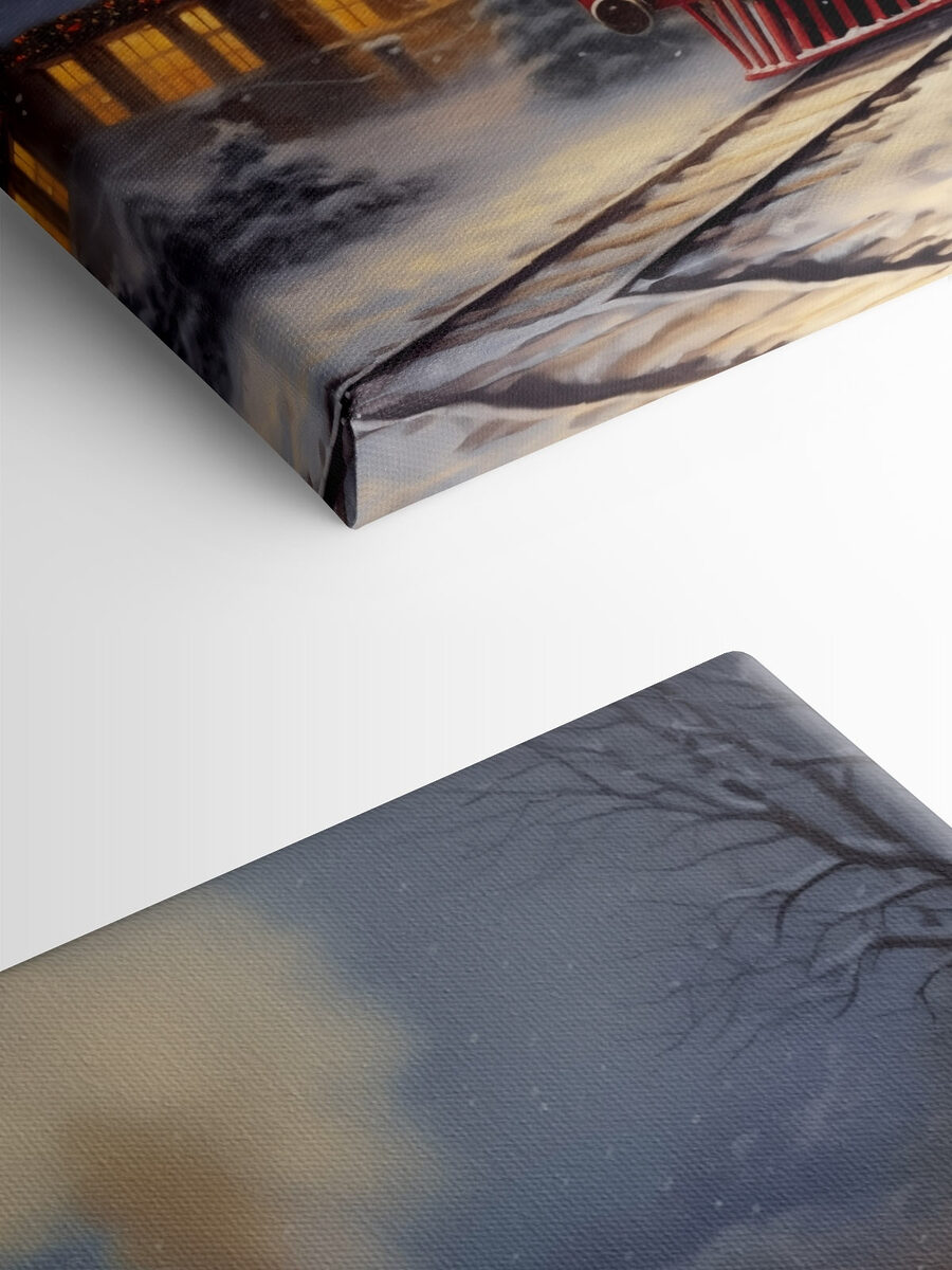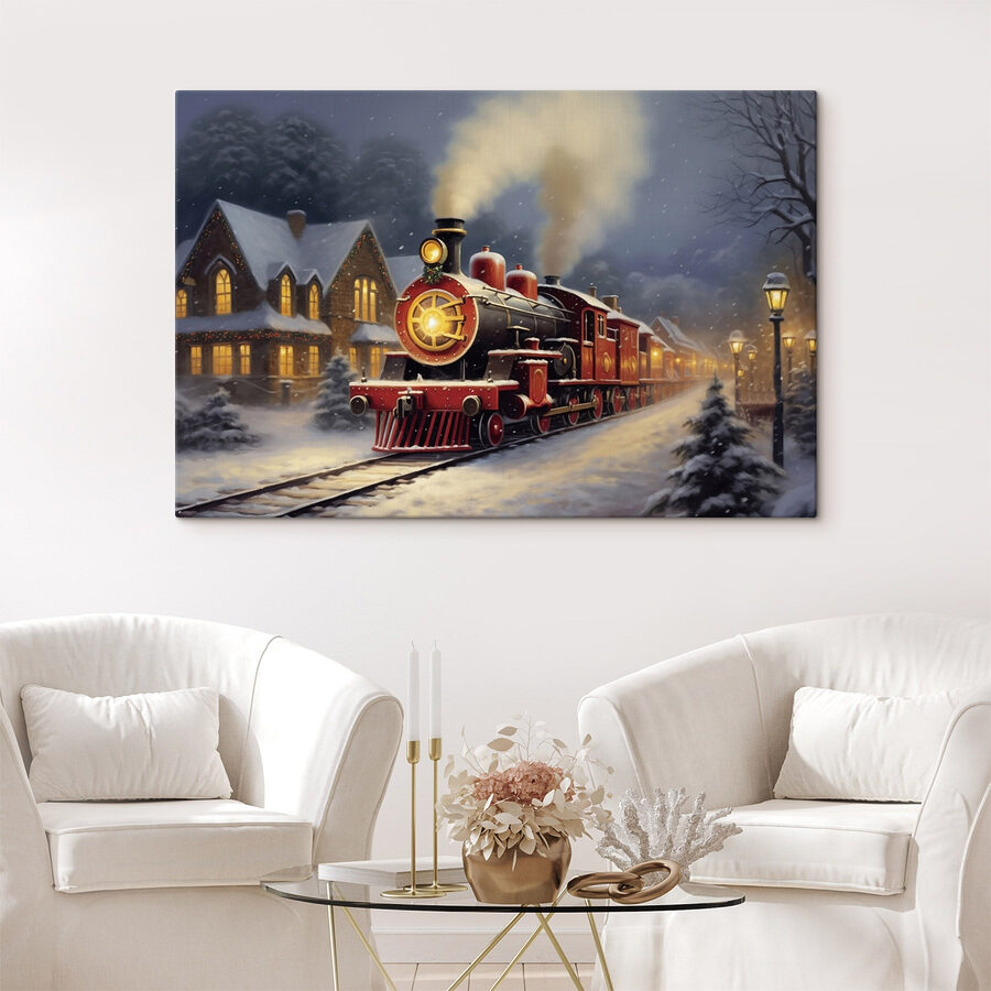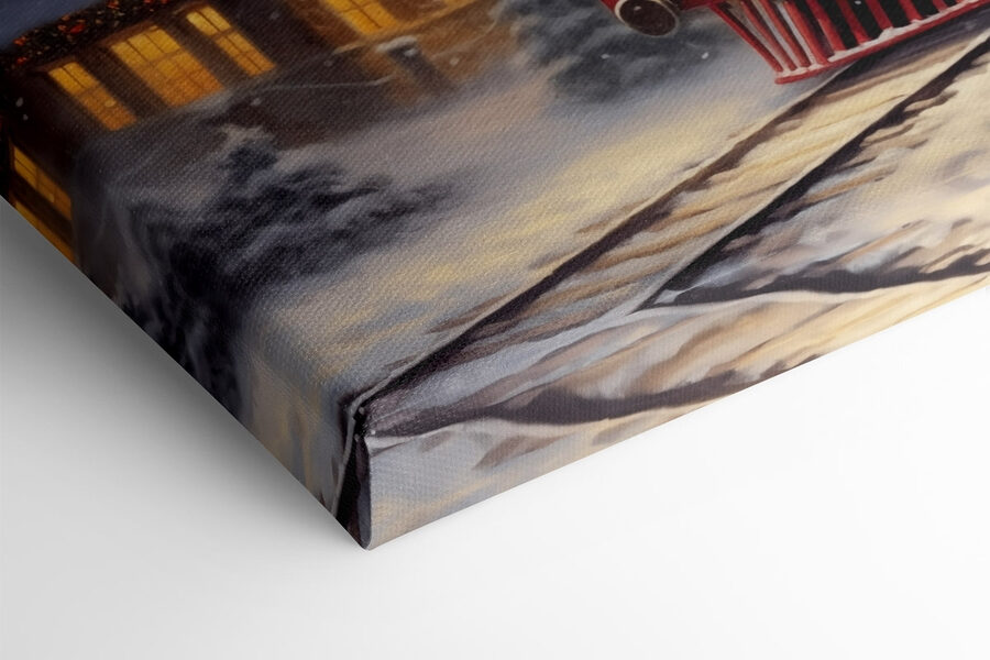Stel je voor dat je lekker knus in een kamer zit met de zachte stilte van vallende sneeuw, en plotseling word je meegenomen naar een andere tijd met deze betoverende canvasprint. “Train on the Tracks in the Snow” vangt de charme van een oude stoomlocomotief die langs een schilderachtig, besneeuwd dorp raast. De warme gloed van de ramen verwelkomt je thuis, terwijl de zachte witte sneeuw alles in het zicht bedekt. Hang hem op en het is alsof je een klein winterwonderland in je kamer uitnodigt. Perfect om gesprekken op gang te brengen of gewoon die nostalgische warmte op te roepen – want wie houdt er nou niet van een beetje treinmagie, vooral als het bedekt is met sneeuwvlokken?
