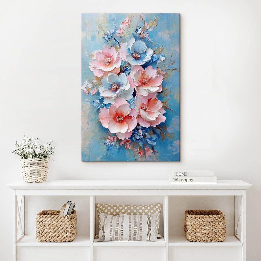 Voeg een vleugje kleur toe aan elke kamer met deze canvasprint van dansende bloemen tegen een levendige blauwe achtergrond. Stel je voor dat je een ruimte binnenloopt en begroet wordt door deze bloemen, hun zachte roze en rustgevende blauw zorgt voor een instant sfeerverruimer. Het is alsof je een stukje natuur hebt dat geen water of zon nodig heeft, alleen je ogen om het te bewonderen. Perfect om een gezellig hoekje levendig te maken of een anders effen muur op te fleuren. Het is een dagelijkse herinnering dat schoonheid zo simpel kan zijn als een bloem, zelfs op de moeilijkste dagen.