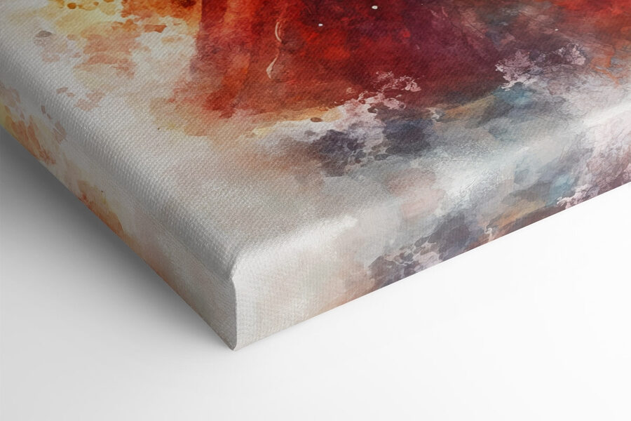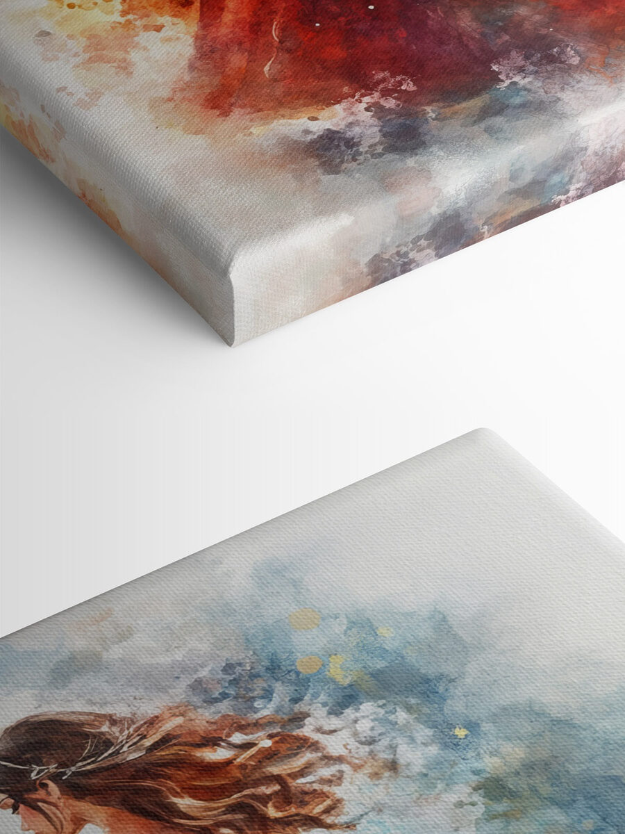 Transformeer elke ruimte met deze prachtige canvasprint van een vrouw in een rode jurk. Het is alsof ze zo uit een dagdroom komt glijden en dat perfecte moment vastlegt waar elegantie en eigenzinnigheid elkaar ontmoeten. De levendige tinten en zachte aquarelstreken creëren een gevoel van beweging dat bijna levend aanvoelt, en voegen een vleugje drama toe aan je muren.