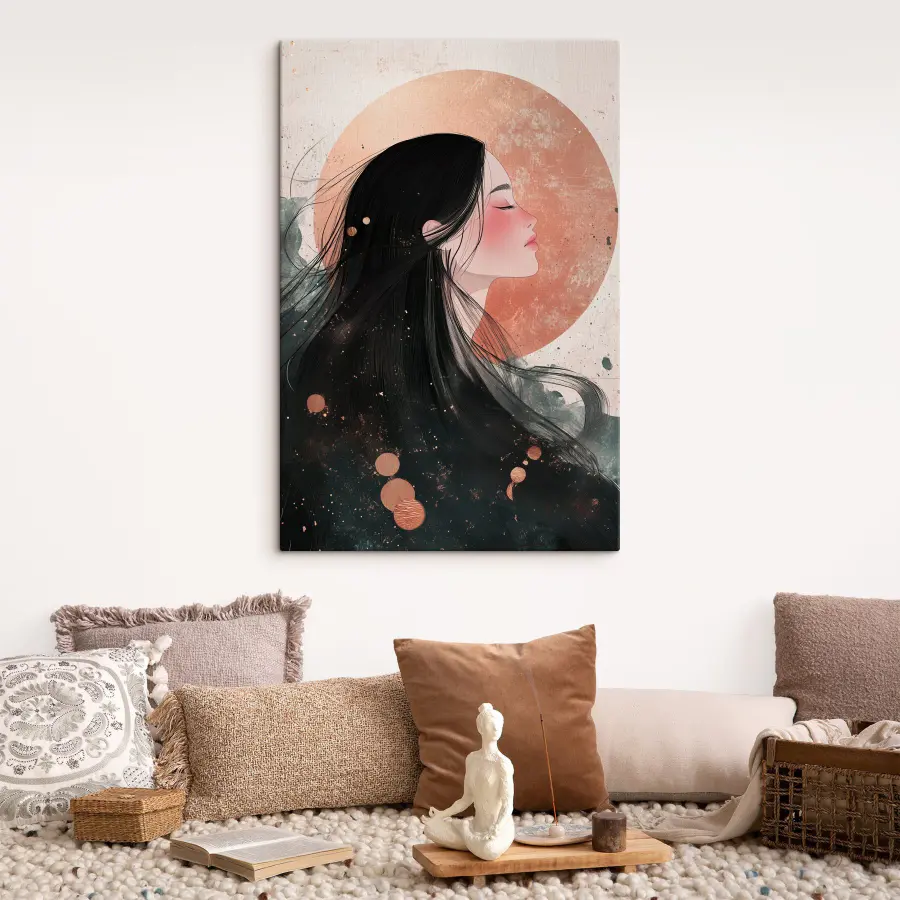 Stel je voor dat je een kamer binnenloopt en begroet wordt door de serene aanwezigheid van een vrouw met lang zwart haar, vastgelegd in deze prachtige canvasprint. Haar profiel, tegen een warme achtergrond, lijkt geheimen van rust en gratie te fluisteren. De mix van zachte kleuren en gedurfde vormen nodigt je uit om een beetje te dagdromen, misschien zelfs om een kopje thee te zetten en de tijd uit het oog te verliezen. Het is niet zomaar kunst; het is alsof je een kalmerende vriend aan de muur hebt hangen die je eraan herinnert om adem te halen. Perfect voor een gezellig hoekje, dit stuk stimuleert gesprekken en voegt een vleugje ziel toe. Versier je ruimte met een stuk dat net zo uniek en intrigerend is als jijzelf!